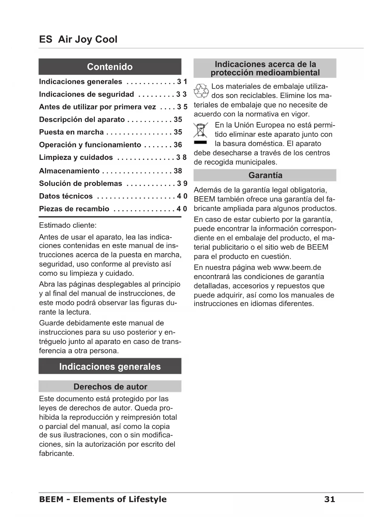 - Numérotation suivant la description de l’appareil31 ES Air Joy Cool BEEM - Elements of Lifestyle Estimado cliente: Antes de usar el aparato, lea las indica- ciones contenidas en este manual de ins- trucciones acerca de la puesta en marcha, seguridad, uso conforme al previsto así como su limpieza y cuidado. Abra las páginas desplegables al principio y al nal del manual de instrucciones, de este modo podrá observar las guras du- rante la lectura. Guarde debidamente este manual de instrucciones para su uso posterior y en- tréguelo junto al aparato en caso de trans- ferencia a otra persona. Indicaciones generales Derechos de autor Este documento está protegido por las leyes de derechos de autor. Queda pro- hibida la reproducción y reimpresión total o parcial del manual, así como la copia de sus ilustraciones, con o sin modica- ciones, sin la autorización por escrito del fabricante. Indicaciones acerca de la protección medioambiental Los materiales de embalaje utiliza- dos son reciclables. Elimine los ma- teriales de embalaje que no necesite de acuerdo con la normativa en vigor. En la Unión Europea no está permi- tido eliminar este aparato junto con la basura doméstica. El aparato debe desecharse a través de los centros de recogida municipales. Garantía Además de la garantía legal obligatoria, BEEM también ofrece una garantía del fa- bricante ampliada para algunos productos. En caso de estar cubierto por la garantía, puede encontrar la información correspon- diente en el embalaje del producto, el ma- terial publicitario o el sitio web de BEEM para el producto en cuestión. En nuestra página web www.beem.de encontrará las condiciones de garantía detalladas, accesorios y repuestos que puede adquirir, así como los manuales de instrucciones en idiomas diferentes. Indicaciones generales ............31 Indicaciones de seguridad .........33 Antes de utilizar por primera vez ....35 Descripción del aparato . . . . . . . . . . . 35 Puesta en marcha . . . . . . . . . . . . . . . . 35 Operación y funcionamiento . . . . . . . 36 Limpieza y cuidados ..............38 Almacenamiento . . . . . . . . . . . . . . . . . 38 Solución de problemas ............39 Datos técnicos ...................40 Piezas de recambio ...............40 Contenido32 Air Joy Cool ES BEEM - Elements of Lifestyle ADVERTENCIA Si el aparato no se utiliza de la forma prevista y/o si se utiliza con otra nali- dad pueden producirse situaciones de peligro. Utilice el equipo únicamente confor- ► me a su uso previsto. Cumpla los procedimientos que se ► describen en este manual de instruc- ciones. Las reclamaciones por daños derivados del uso no conforme al previsto quedarán invalidadas de forma inmediata. El riesgo es responsabilidad única del usuario. Exenciones de responsabilidad No nos hacemos responsables de los da- ños directos o indirectos derivados de: El incumplimiento del manual de ins- ■ trucciones. El uso no conforme a lo previsto. ■ La manipulación incorrecta o inade- ■ cuada. La realización incorrecta de reparacio- ■ nes. Las modicaciones no permitidas. ■ El uso de piezas o repuestos de ter- ■ ceros. El uso de complementos y accesorios ■ inadecuados. Declaración de conformidad Mediante la presente, BEEM declara que este aparato cumple con los requisitos básicos y las demás disposiciones re- levantes de las directivas 2006/95/CE, 2004/108/CE y 2009/125/CE. Símbolos utilizados PELIGRO Se utiliza cuando exista una situación de peligro inminente que pueda conlle- var lesiones corporales graves o incluso la muerte. Para evitar el peligro siga elmente ► estas instrucciones. ADVERTENCIA Se utiliza cuando exista una situación potencial de peligro que pueda conllevar lesiones corporales graves o incluso la muerte. Para evitar el peligro siga elmente ► estas instrucciones. ATENCIÓN Se utiliza cuando exista una situación potencial de peligro que pueda conllevar lesiones leves o daños materiales. Para evitar el peligro siga elmente ► estas instrucciones. INDICACIÓN Una indicación contiene información ► adicional para facilitar el uso del aparato. Uso conforme al previsto Este aparato se ha diseñado preferente- mente para el uso particular en interiores, con el n de generar un caudal de aire continuo ajustable. Cualquier uso diferen- te o excesivo se considerará no conforme al previsto.33 ES Air Joy Cool BEEM - Elements of Lifestyle Indicaciones de seguridad Antes de utilizar el aparato, revise que ■ el aparato no presente daños exter- nos. No encienda nunca el aparato si está dañado. Este aparato no es apto para el uso ■ por parte de personas (incluidos los niños) cuyas limitaciones físicas, psí- quicas o sensoriales, así como su falta de experiencia y/o de conocimientos, no les permitan saber cómo funciona el aparato, salvo bajo la vigilancia o las instrucciones de una persona res- ponsable. Los niños deben estar vigilados para ■ asegurarse de que no jueguen con el aparato. Guarde el aparato fuera del alcance ■ de los niños. Encargue las reparaciones del aparato ■ siempre a un distribuidor autorizado o al servicio técnico de fábrica; esto tie- ne especial importancia si se tiene que sustituir un cable de conexión deterio- rado. Una reparación indebida puede provocar situaciones graves de peligro para el usuario. Además, la garantía quedará invalidada. Las reparaciones del aparato dentro ■ del periodo de garantía deberán ser realizadas únicamente por un servicio técnico autorizado por el fabricante, ya que de lo contrario cualquier daño o avería derivada del mismo quedará excluido de la garantía. Los componentes defectuosos se de- ■ berán sustituir únicamente por piezas de repuesto originales. Esta es la úni- ca forma de garantizar que se cumplan los requisitos de seguridad. PELIGRO ¡Peligros relacionados con la electrici- dad! No utilice el aparato si el cable de ► alimentación o la clavija de red están dañados. No a