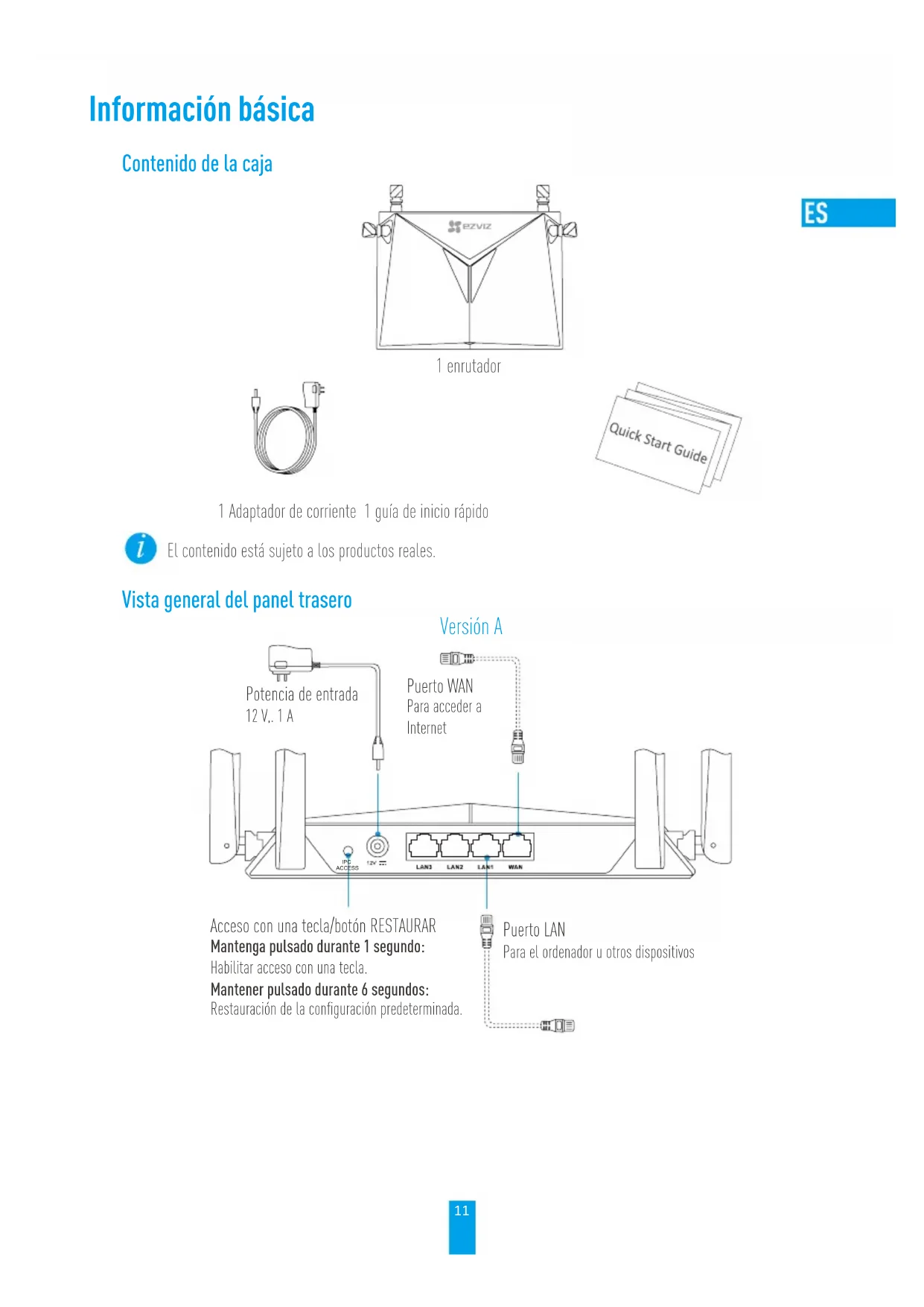 mit dem WLAN herzustellen.11 Información básica Contenido de la caja 1 enrutador 1 Adaptador de corriente 1 guía de inicio rápido El contenido está sujeto a los productos reales. Vista general del panel trasero Versión A IPC ACCESS Potencia de entrada 12 V,. 1 A Acceso con una tecla/botón RESTAURAR Mantenga pulsado durante 1 segundo: Habilitar acceso con una tecla. Mantener pulsado durante 6 segundos: Restauración de la configuración predeterminada. Puerto WAN Para acceder a Internet Puerto LAN Para el ordenador u otros dispositivos12 Versión B Puerto WAN Para acceder a Internet Potencia de entrada 12 V; 1,5 A Puerto LAN Para el ordenador u otros dispositivos Acceso con una tecla/botón RESTAURAR Mantenga pulsado durante 1 segundo: Habilitar acceso con una tecla Mantener pulsado durante 6 segundos: Restauración de la configuración predeterminada Encendido/apagado *Puerto USB Para discos USB o discos duros portátiles, etc.