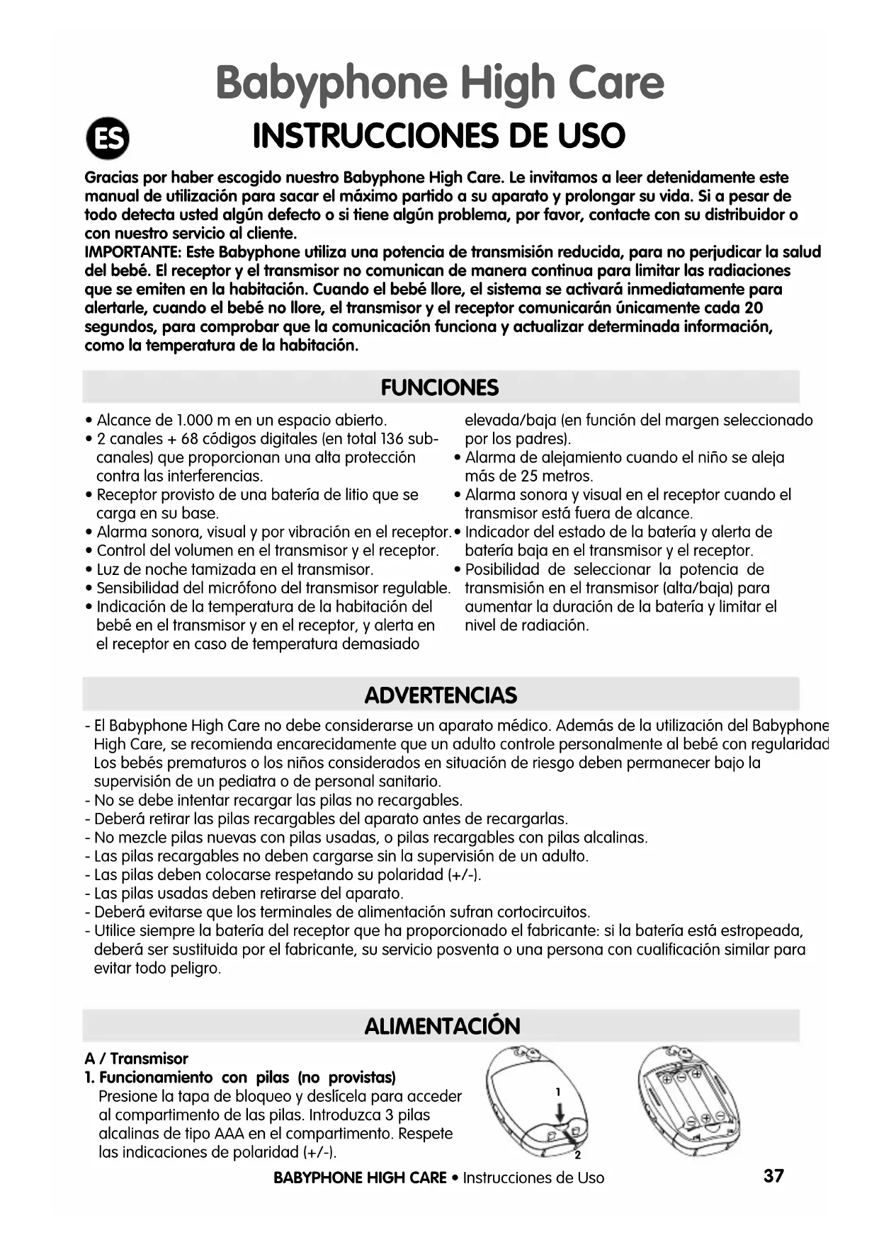 ADVERTENCIAS - El Babyphone High Care no debe considerarse un aparato médico. Además de la utilización del BabyphoneHigh Care, se recomienda encarecidamente que un adulto controle personalmente al bebé con regularidad.Los bebés prematuros o los niños considerados en situación de riesgo deben permanecer bajo lasupervisión de un pediatra o de personal sanitario.- No se debe intentar recargar las pilas no recargables.- Deberá retirar las pilas recargables del aparato antes de recargarlas.- No mezcle pilas nuevas con pilas usadas, o pilas recargables con pilas alcalinas.- Las pilas recargables no deben cargarse sin la supervisión de un adulto.- Las pilas deben colocarse respetando su polaridad (+/-).- Las pilas usadas deben retirarse del aparato.- Deberá evitarse que los terminales de alimentación sufran cortocircuitos.- Utilice siempre la batería del receptor que ha proporcionado el fabricante: si la batería está estropeada,deberá ser sustituida por el fabricante, su servicio posventa o una persona con cualificación similar paraevitar todo peligro. ALIMENTACIÓN A / Transmisor1. Funcionamiento con pilas (no provistas)Presione la tapa de bloqueo y deslícela para accederal compartimento de las pilas. Introduzca 3 pilasalcalinas de tipo AAA en el compartimento. Respetelas indicaciones de polaridad (+/-). Babyphone High Care