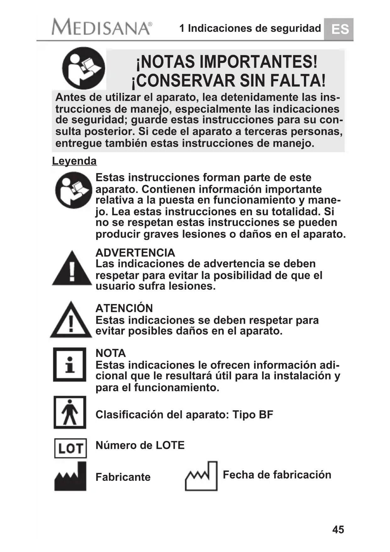 7 Garantie 44Estas instrucciones forman parte de este aparato. Contienen información importante relativa a la puesta en funcionamiento y mane- jo. Lea estas instrucciones en su totalidad. Si no se respetan estas instrucciones se pueden producir graves lesiones o daños en el aparato. ADVERTENCIA Las indicaciones de advertencia se deben respetar para evitar la posibilidad de que el usuario sufra lesiones. ATENCIÓN Estas indicaciones se deben respetar para evitar posibles daños en el aparato. NOTA Estas indicaciones le ofrecen información adi- cional que le resultará útil para la instalación y para el funcionamiento. Leyenda Número de LOTE Fabricante ¡NOTAS IMPORTANTES! ¡CONSERVAR SIN FALTA! Antes de utilizar el aparato, lea detenidamente las ins- trucciones de manejo, especialmente las indicaciones de seguridad; guarde estas instrucciones para su con- sulta posterior. Si cede el aparato a terceras personas, entregue también estas instrucciones de manejo. Clasificación del aparato: Tipo BF Fecha de fabricación