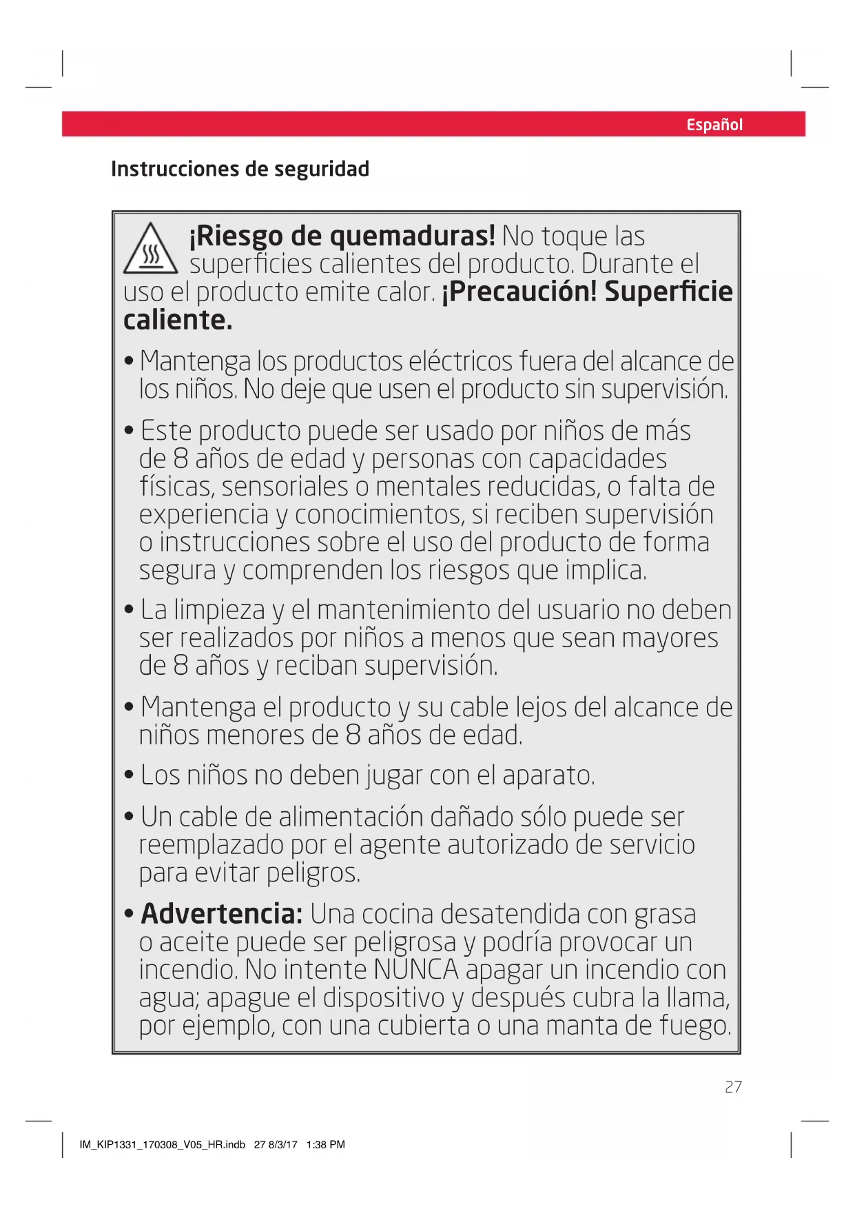 - Advertencia: Una cocina desatendida con grasa o aceite puede ser peligrosa y podría provocar un incendio. No intente NUNCA apagar un incendio con agua; apague el dispositivo y después cubra la llama, por ejemplo, con una cubierta o una manta de fuego. IM_KIP1331_170308_V05_HR.indb 27 8/3/17 1:38 PMEspañol