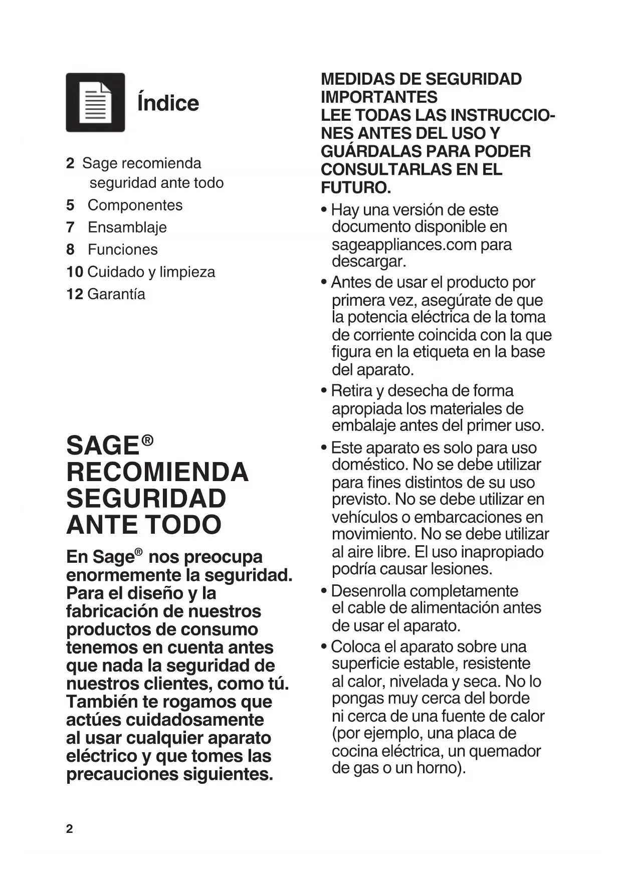- Coloca el aparato sobre una supercie estable, resistente al calor, nivelada y seca. No lo pongas muy cerca del borde ni cerca de una fuente de calor (por ejemplo, una placa de cocina eléctrica, un quemador de gas o un horno). 2 Sage recomienda seguridad ante todo5 Componentes7 Ensamblaje8 Funciones10 Cuidado y limpieza12 Garantía Índice3