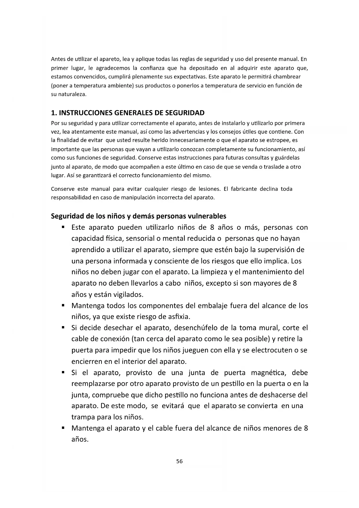 Por su seguridad y para utilizar correctamente el aparato, antes de instalarlo y utilizarlo por primera vez, lea atentamente este manual, así como las advertencias y los consejos útiles que contiene. Con la finalidad de evitar que usted resulte herido innecesariamente o que el aparato se estropee, es importante que las personas que vayan a utilizarlo conozcan completamente su funcionamiento, así como sus funciones de seguridad. Conserve estas instrucciones para futuras consultas y guárdelas junto al aparato, de modo que acompañen a este último en caso de que se venda o traslade a otro lugar. Así se garantizará el correcto funcionamiento del mismo. Conserve este manual para evitar cualquier riesgo de lesiones. El fabricante declina toda responsabilidad en caso de manipulación incorrecta del aparato. Seguridad de los niños y demás personas vulnerables Este aparato pueden utilizarlo niños de 8 años o más, personas con capacidad física, sensorial o mental reducida o personas que no hayan aprendido a utilizar el aparato, siempre que estén bajo la supervisión de una persona informada y consciente de los riesgos que ello implica. Los niños no deben jugar con el aparato. La limpieza y el mantenimiento del aparato no deben llevarlos a cabo niños, excepto si son mayores de 8 años y están vigilados. Mantenga todos los componentes del embalaje fuera del alcance de los niños, ya que existe riesgo de asfixia. Si decide desechar el aparato, desenchúfelo de la toma mural, corte el cable de conexión (tan cerca del aparato como le sea posible) y retire la puerta para impedir que los niños jueguen con ella y se electrocuten o se encierren en el interior del aparato. Si el aparato, provisto de una junta de puerta magnética, debe reemplazarse por otro aparato provisto de un pestillo en la puerta o en la junta, compruebe que dicho pestillo no funciona antes de deshacerse del aparato. De este modo, se evitará que el aparato se convierta en una trampa para los niños. Mantenga el aparato y el cable fuera del alcance de niños menores de 8 años.57 Los niños de 3 a 8 años pueden cargar o descargar este dispositivo. Los niños deben ser supervisados para que no jueguen con el dispositivo. Seguridad general ATENCIÓN: Este electrodoméstico está previsto para utilizarse en una vivienda. ATENCIÓN: No guarde bajo ninguna circunstancia sustancias inflamables como aerosoles dentro del aparato, ya que podrían derramarse. ATENCIÓN: Si el cable de alimentación está estropeado, deberá reemplazarlo inmediatamente solicitándolo al fabricante o a un distribuidor cualificado para evitar cualquier riesgo de electrocución. ATENCIÓN: Este dispositivo solo debe instalarse en una instalación gratuita, en ningún caso debe instalarse de forma integrada o integrable. ATENCIÓN: No estropee el circuito de refrigeración. ATENCIÓN: No utilice aparatos eléctricos dentro del compartimento, excepto si estos últimos son aceptados por el fabricante. Atención: Riesgo de incendio Si el circuito de refrigeración resultara dañado: Evite las llamas abiertas y cualquier otra fuente de inflamación. Ventile bien la habitación en la que se encuentre el aparato. Es peligroso realizar cualquier tipo de modificación que afecte a la composición del aparato. Cualquier daño provocado al cable puede causar un cortocircuito o una electrocución. Seguridad eléctrica Declinamos toda responsabilidad en caso de incidente causado por una mala instalación eléctrica. El cable de alimentación no debe alargarse. No utilice ningún alargador, ningún adaptador ni ninguna toma múltiple. Compruebe que la toma mural no esté dañada. Una toma mural en mal estado puede ocasionar un calentamiento excesivo del aparato y su explosión. Compruebe que puede acceder a la toma mural del aparato. No tire en ningún caso del cable principal. No elimine en ningún caso la toma de tierra. Si la toma mural está floja, no enchufe el cable. Existe riesgo de electrocución o incendio. En ningún caso debe utilizar el aparato si el protector de la iluminación interior no está instalado. Este aparato funciona con una corriente monofásica de 220~240 V/50 Hz. El aparato debe utilizar una oma mural conectada a tierra según las recomendaciones vigentes. Si el cable de alimentación está estropeado, no lo reemplace. Póngase en contacto con el servicio posventa. La toma de corriente debe estar accesible fácilmente pero fuera del alcance de los niños. En caso de duda, consulte al instalador.58 Utilización diaria No almacene en ningún caso sustancias ni líquidos inflamables dentro del aparato, pues implicaría un riesgo de explosión. No ponga en funcionamiento otros aparatos eléctricos dentro del aparato (batidoras, heladeras eléctricas, etc.). Cuando desenchufe el aparato, agarre la toma con las manos y no tire del cable. No exponga el aparato directamente al sol. El aparato debe mantenerse alejado de velas, luminarias y demás llamas abiertas para evitar riesgos de incendio. Este aparato está destinado exclusivamente para el almacenamiento de bebidas. El aparato es pesado. Sea prudente cuando tenga que desplazarlo. Si el aparato está provisto de ruedas, recuerde que estas sirven únicamente para facilitar pequeños movimientos. No lo desplace en trayectos largos. No utilice en ningún caso el aparato o sus elementos para apoyarse. Para evitar que caigan objetos e impedir el deterioro del aparato, no sobrecargue los compartimentos del aparato. Atención: Limpieza y mantenimiento Antes de realizar el mantenimiento, desconecte el aparato y corte la corriente. No limpie el aparato con objetos metálicos, sistemas a vapor, aceites volátiles, disolventes orgánicos o componentes abrasivos. No utilice objetos cortantes ni puntiagudos para retirar el hielo. Utilice un rascador de plástico. Información importante acerca de la instalación Esta unidad es para instalación independiente solamente. Nunca debe estar incorporada o 