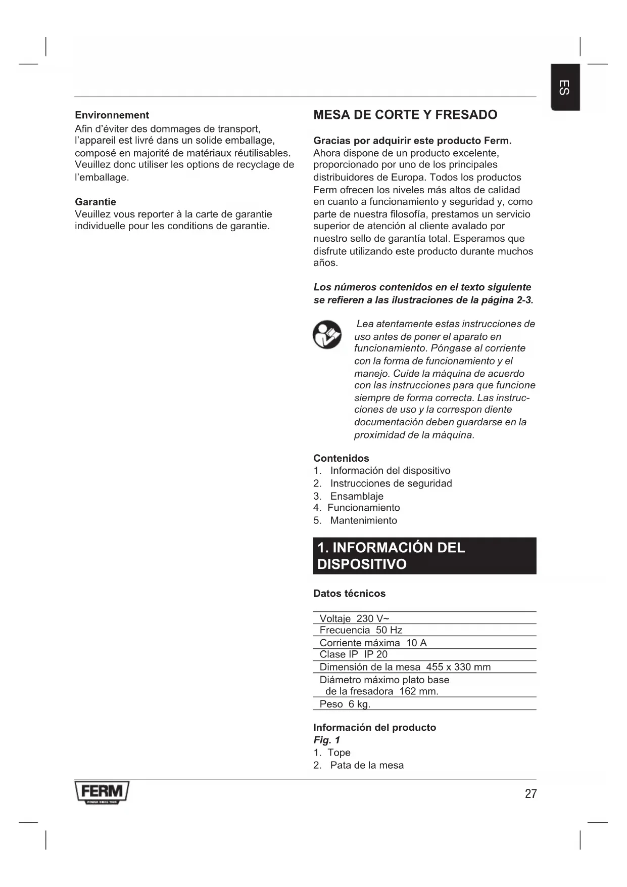DISPOSITIVO Datos técnicos Voltaje 230 V~ Frecuencia 50 Hz Corriente máxima 10 A Clase IP IP 20 Dimensión de la mesa 455 x 330 mm Diámetro máximo plato base de la fresadora 162 mm. Peso 6 kg. Información del producto Fig. 1