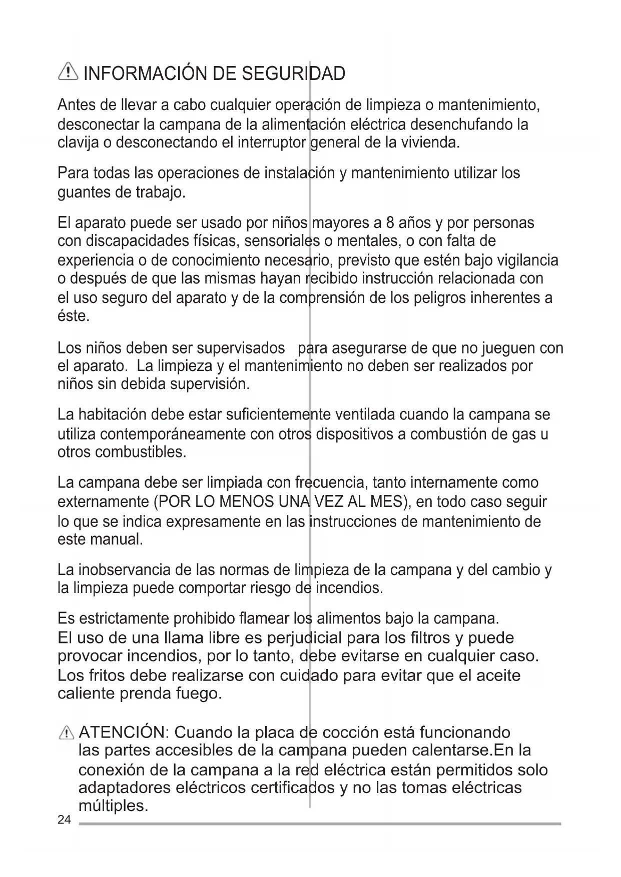 Antesdellevaracabocualquieroperacióndelimpiezaomantenimiento, desconectar la campana de la alimentación eléctrica desenchufando la clavijaodesconectandoelinterruptorgeneraldelavivienda. Paratodaslasoperacionesdeinstalaciónymantenimientoutilizarlos guantesdetrabajo. Elaparatopuedeserusadoporniñosmayoresa8añosyporpersonas condiscapacidadesfísicas,sensorialesomentales,oconfaltade experienciaodeconocimientonecesario,previstoqueesténbajovigilancia odespuésdequelasmismashayanrecibidoinstrucciónrelacionadacon elusosegurodelaparatoydelacomprensióndelospeligrosinherentesa éste. Los niños deben ser supervisados para asegurarse de que no jueguen con elaparato.Lalimpiezayelmantenimientonodebenserrealizadospor niñossindebidasupervisión. Lahabitacióndebeestarsucientementeventiladacuandolacampanase utiliza contemporáneamente con otros dispositivos a combustión de gas u otroscombustibles. Lacampanadebeserlimpiadaconfrecuencia,tantointernamentecomo externamente(PORLOMENOSUNAVEZALMES),entodocasoseguir lo que se indica expresamente en las instrucciones de mantenimiento de estemanual. Lainobservanciadelasnormasdelimpiezadelacampanaydelcambioy lalimpiezapuedecomportarriesgodeincendios. Esestrictamenteprohibidoamearlosalimentosbajolacampana. Elusodeunallamalibreesperjudicialparalosltrosypuede provocarincendios,porlotanto,debeevitarseencualquiercaso. Los fritos debe realizarse con cuidado para evitar que el aceite calienteprendafuego. ATENCIÓN: Cuando la placa de cocción está funcionando laspartesaccesiblesdelacampanapuedencalentarse.Enla conexión de la campana a la red eléctrica están permitidos solo adaptadoreseléctricoscertificadosynolastomaseléctricas múltiples.25