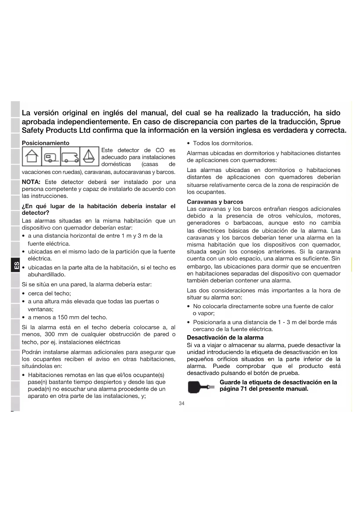 - Habitaciones remotas en las que el/los ocupante(s) pase(n) bastante tiempo despiertos y desde las que pueda(n) no escuchar una alarma procedente de un aparato en otra parte de las instalaciones, y; La versión original en inglés del manual, del cual se ha realizado la traducción, ha sido aprobada independientemente. En caso de discrepancia con partes de la traducción, Sprue Safety Products Ltd conrma que la información en la versión inglesa es verdadera y correcta.