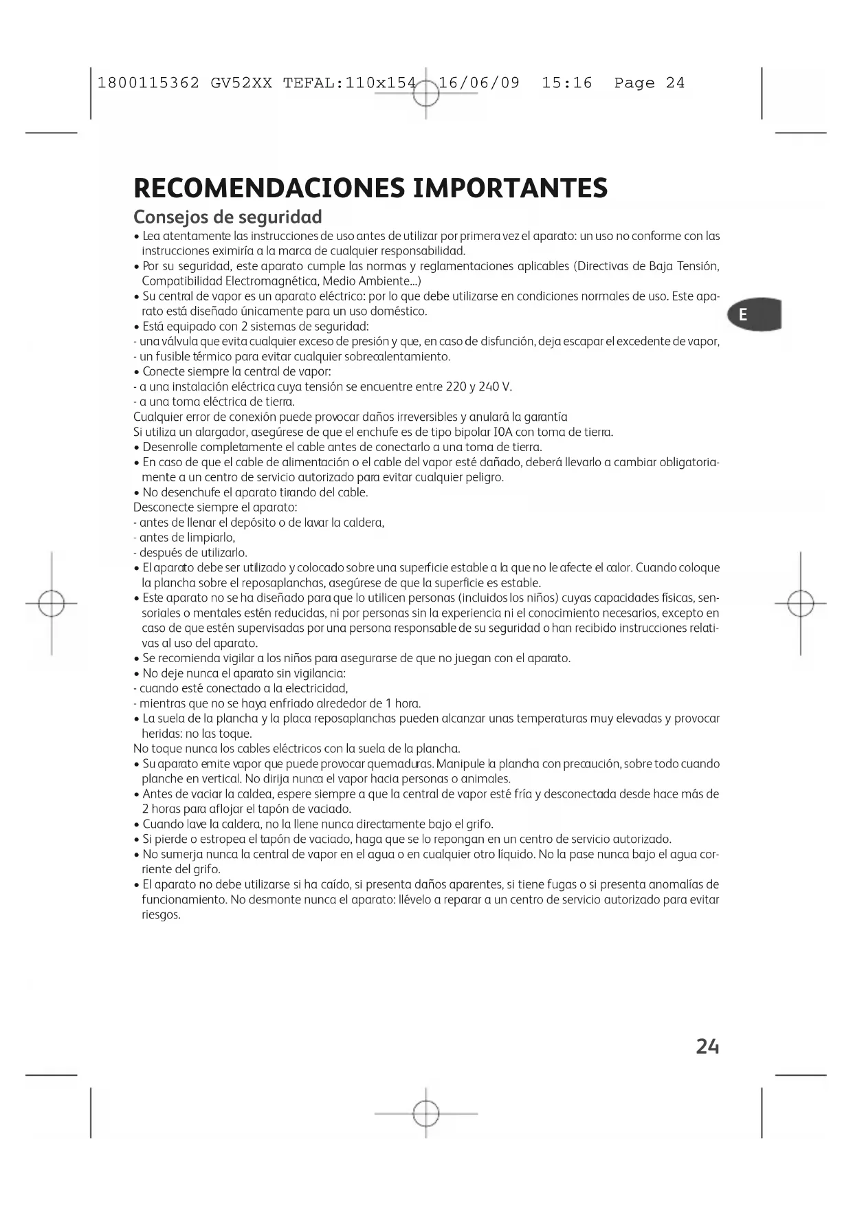 - Para obtener un buen resultado, le aconsejamosque repita la operación una segunda vez. ¿Un problema con el generador? Problemas Causas probables Soluciones La central de vapor no se enciende o el piloto de la plancha no está encendido. El aparato no está conectado a la corriente. Asegúrese de que el aparato se encuentra correctamente conectadoa una toma que funcione y de quetiene corriente. El agua corre por los orificios de la suela.El termostato está desajustado: Latemperatura sigue siendodemasiado baja.Póngase en contacto con el centrode servicio autorizado.Está utilizando el vapor mientrasque la plancha aun no haalcanzado la temperaturasuficiente.Compruebe el ajuste del termostato. Espere a que el piloto de la plancha se haya apagado para accionar el mando de vapor.El agua se ha condensado en lostubos, ya que está utilizando el vaporpor primera vez o no lo ha utilizadodesde hace algún tiempo. Pulse el mando de vapor fuera de la mesa de planchar, hasta que laplancha emita vapor. No coloque nunca la planchaen un reposa-plancha metá-lico, porque podría dañarla; tilice la placa reposa-plancha de la base: está provista de topes anti-deslizantes y se ha diseñado para resistir tempe-raturas elevadas.Si el agua es calcárea,aumente las frecuen-cias.Ante todo, no utiliceproductos descalcifica-dores para aclarar elcalderín : podrían da-ñarlo. 1800115362 GV52XX TEFAL:110x154 16/06/09 15:16 Page 2728 Si no puede determinar la causa de una avería, acuda a un centro de servicio postventa autorizado. ¡Contribuyamos a la protección del medioambiente!