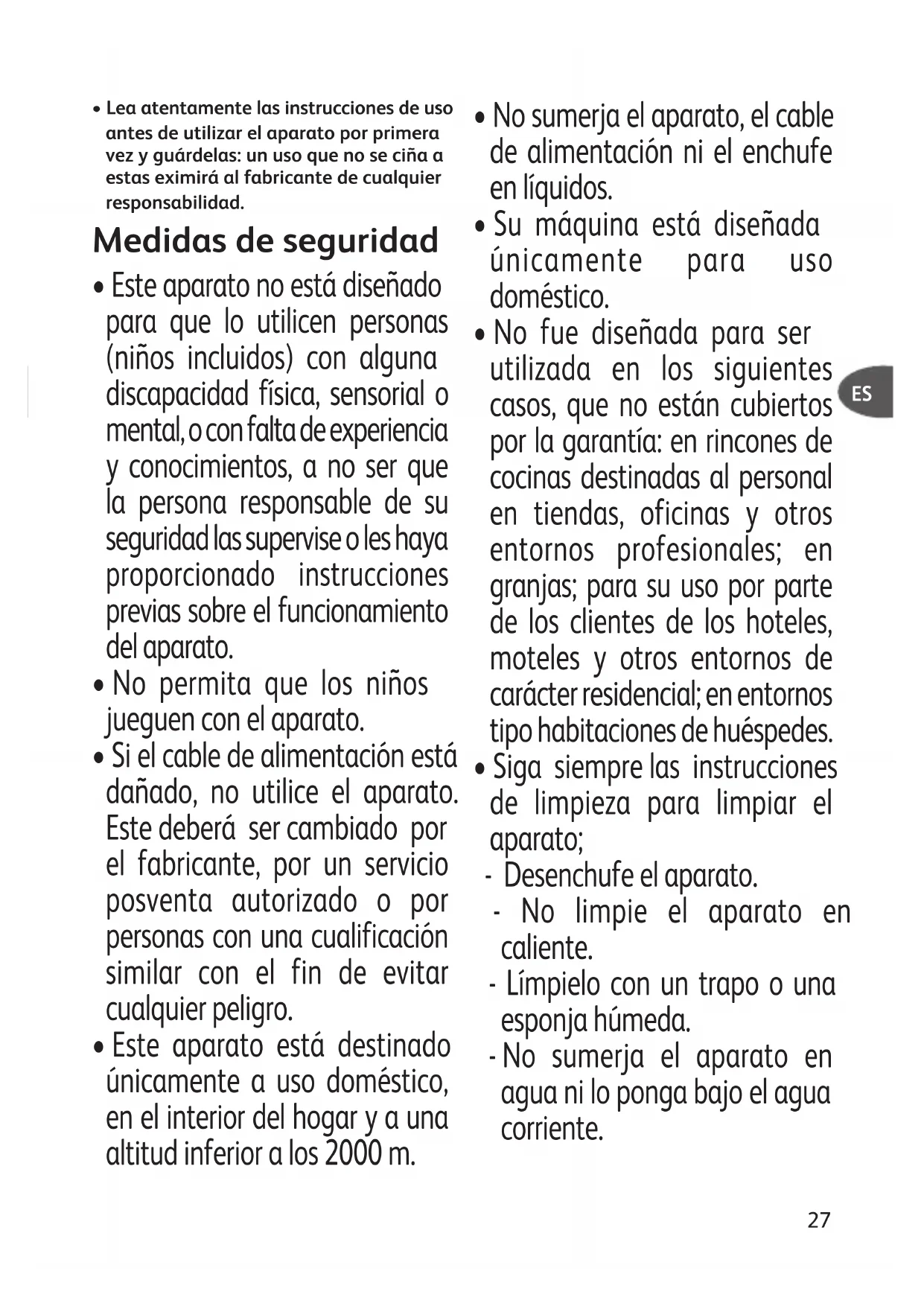 - Lea atentamente las instrucciones de uso antes de utilizar el aparato por primera vez y guárdelas: un uso que no se ciña a estas eximirá al fabricante de cualquier responsabilidad. Medidas de seguridad