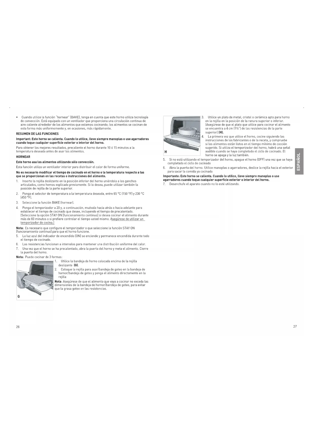 . Utiliceunplatodemetal,cristalocerámicaaptoparahorno enlarejillaenlaposicióndelaranurasuperioroinferior. (Asegúresedequeelplatoqueutiliceparacocinarelalimento seencuentraacm(½”)delasresistenciasdelaparte superior)(H). . Laprimeravezqueutiliceelhorno,cocinesiguiendolas instruccionesdelosfabricantesodelareceta,ycompruebe silosalimentosestánlistoseneltiempomínimodecocción sugerido.Siutilizaeltemporizadordelhorno,habráunaseñal audiblecuandosehayacompletadoelciclodecocinado.El hornoseapagaylaluztambién. . Sinoestáutilizandoeltemporizadordelhorno,apagueelhorno(OFF)unavezquesehaya completadoelciclodecocinado . Abralapuertadelhorno.Utilicemanoplasoagarradores,deslicelarejillahaciaelexterior parasacarlacomidayacocinada Importante: Este horno se calienta. Cuando lo utilice, lleve siempre manoplas o use agarradores cuando toque cualquier superficie exterior o interior del horno. . Desenchufeelaparatocuandonoloestéutilizando. ESPAÑOL