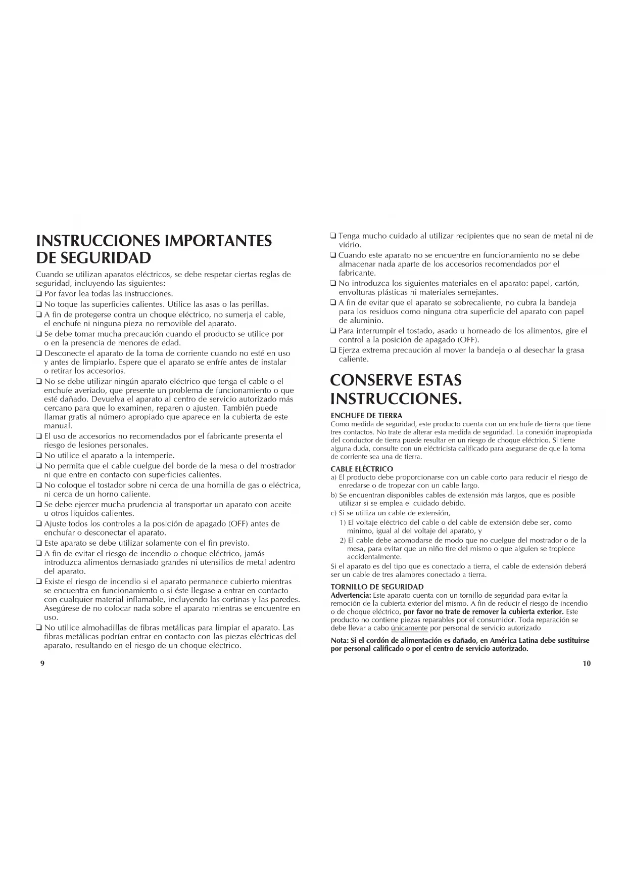 INSTRUCCIONES IMPORTANTES DE SEGURIDAD Cuando se utilizan aparatos eléctricos, se debe respetar ciertas reglas de seguridad, incluyendo las siguientes: ❑ Por favor lea todas las instrucciones. ❑ No toque las superficies calientes. Utilice las asas o las perillas. ❑ A fin de protegerse contra un choque eléctrico, no sumerja el cable, el enchufe ni ninguna pieza no removible del aparato. ❑ Se debe tomar mucha precaución cuando el producto se utilice por o en la presencia de menores de edad. ❑ Desconecte el aparato de la toma de corriente cuando no esté en uso y antes de limpiarlo. Espere que el aparato se enfríe antes de instalar o retirar los accesorios. ❑ No se debe utilizar ningún aparato eléctrico que tenga el cable o el enchufe averiado, que presente un problema de funcionamiento o que esté dañado. Devuelva el aparato al centro de servicio autorizado más cercano para que lo examinen, reparen o ajusten. También puede llamar gratis al número apropiado que aparece en la cubierta de este manual. ❑ El uso de accesorios no recomendados por el fabricante presenta el riesgo de lesiones personales. ❑ No utilice el aparato a la intemperie. ❑ No permita que el cable cuelgue del borde de la mesa o del mostrador ni que entre en contacto con superficies calientes. ❑ No coloque el tostador sobre ni cerca de una hornilla de gas o eléctrica, ni cerca de un horno caliente. ❑ Se debe ejercer mucha prudencia al transportar un aparato con aceite u otros líquidos calientes. ❑ Ajuste todos los controles a la posición de apagado (OFF) antes de enchufar o desconectar el aparato. ❑ Este aparato se debe utilizar solamente con el fin previsto. ❑ A fin de evitar el riesgo de incendio o choque eléctrico, jamás introduzca alimentos demasiado grandes ni utensilios de metal adentro del aparato. ❑ Existe el riesgo de incendio si el aparato permanece cubierto mientras se encuentra en funcionamiento o si éste llegase a entrar en contacto con cualquier material inflamable, incluyendo las cortinas y las paredes. Asegúrese de no colocar nada sobre el aparato mientras se encuentre en uso. ❑ No utilice almohadillas de fibras metálicas para limpiar el aparato. Las fibras metálicas podrían entrar en contacto con las piezas eléctricas del aparato, resultando en el riesgo de un choque eléctrico. ❑ Tenga mucho cuidado al utilizar recipientes que no sean de metal ni de vidrio. ❑ Cuando este aparato no se encuentre en funcionamiento no se debe almacenar nada aparte de los accesorios recomendados por el fabricante. ❑ No introduzca los siguientes materiales en el aparato: papel, cartón, envolturas plásticas ni materiales semejantes. ❑ A fin de evitar que el aparato se sobrecaliente, no cubra la bandeja para los residuos como ninguna otra superficie del aparato con papel de aluminio. ❑ Para interrumpir el tostado, asado u horneado de los alimentos, gire el control a la posición de apagado (OFF). ❑ Ejerza extrema precaución al mover la bandeja o al desechar la grasa caliente. CONSERVE ESTAS INSTRUCCIONES.
