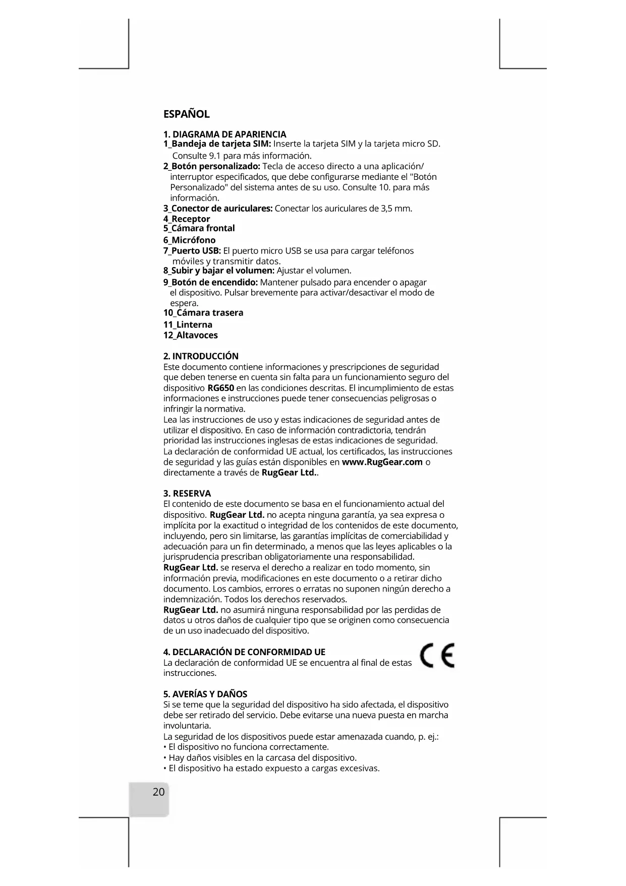 Este documento contiene informaciones y prescripciones de seguridad que deben tenerse en cuenta sin falta para un funcionamiento seguro del dispositivo RG650 en las condiciones descritas. El incumplimiento de estas informaciones e instrucciones puede tener consecuencias peligrosas o infringir la normativa. Lea las instrucciones de uso y estas indicaciones de seguridad antes de utilizar el dispositivo. En caso de información contradictoria, tendrán prioridad las instrucciones inglesas de estas indicaciones de seguridad. La declaración de conformidad UE actual, los certificados, las instrucciones de seguridad y las guías están disponibles en www.RugGear.com o directamente a través de RugGear Ltd..