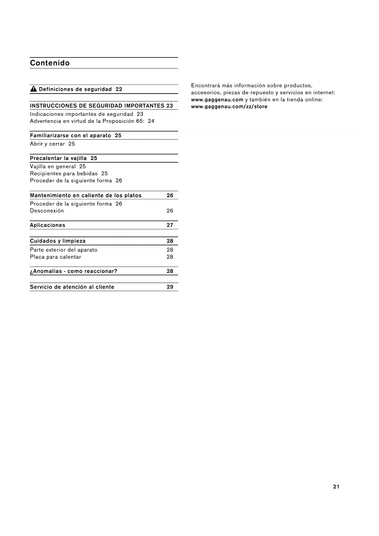 Indicaciones importantes de seguridad 23 Advertencia en virtud de la Proposición 65: 24 Familiarizarse con el aparato 25 Abrir y cerrar 25 Precalentar la vajilla 25 Vajilla en general 25 Recipientes para bebidas 25 Proceder de la siguiente forma 26 Mantenimiento en caliente de los platos 26 Proceder de la siguiente forma 26 Desconexión 26 Aplicaciones 27 Cuidados y limpieza 28 Parte exterior del aparato 28 Placa para calentar 28 ¿Anomalías - como reaccionar? 28 Servicio de atención al cliente 29 Encontrará más información sobre productos, accesorios, piezas de repuesto y servicios en internet: www.gaggenau.com y también en la tienda online: www.gaggenau.com/zz/store22 9 Definiciones de seguridad Definiciones de seguri dad 9 ADVERTENCIA Esto indica que pueden producirse heridas graves o incluso la muerte si no se cumple con esta advertencia. 9 ATENCION Esto indica que pueden producirse heridas leves o moderadas si no se cumple con esta advertencia. AVISO: Esto indica que pueden producirse daños en el aparato o en los bienes si no se cumple con este aviso. Nota: Esto alerta sobre información o sugerencias importantes.23
