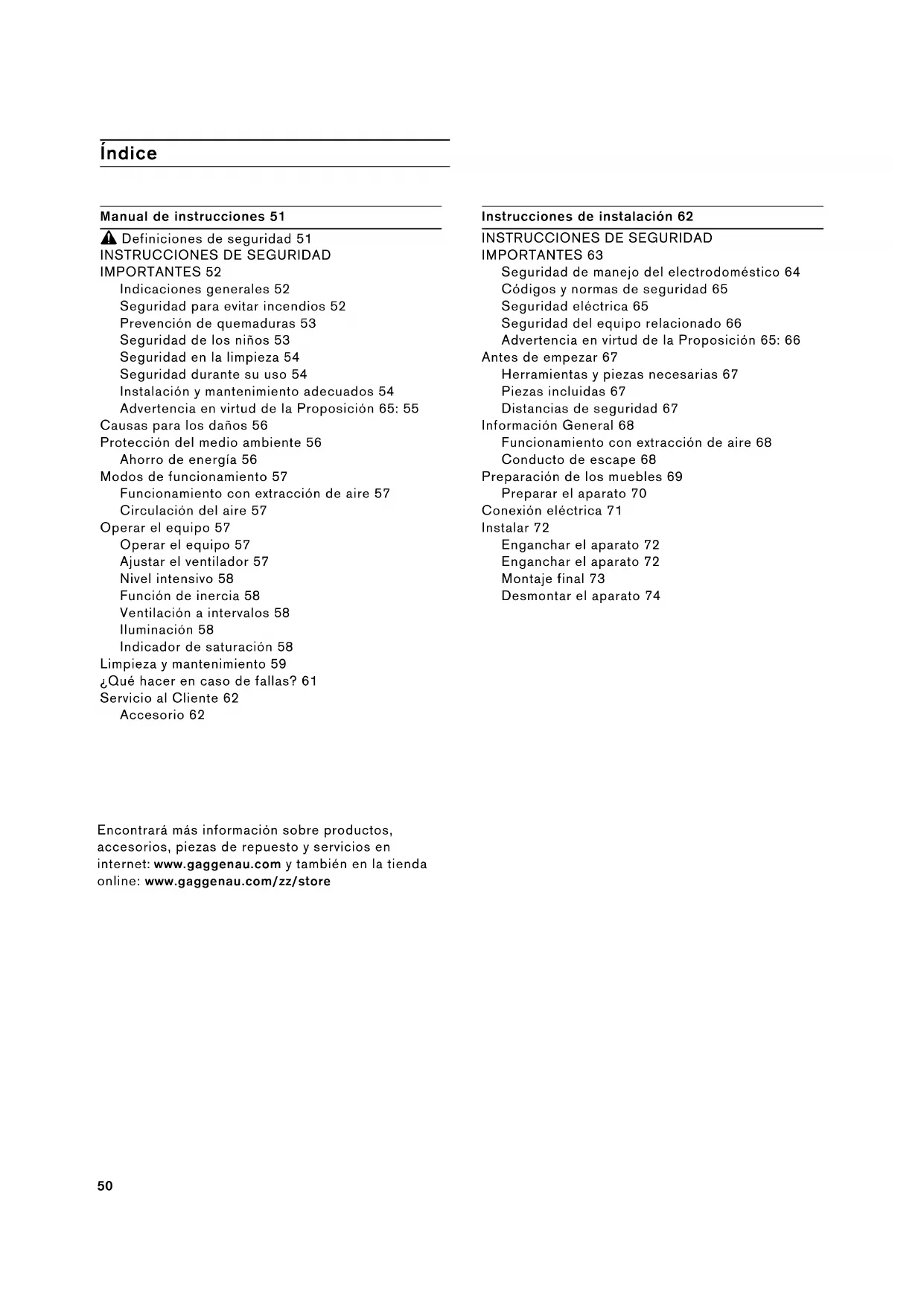 IMPORTANTES 52 Indicaciones generales 52 Seguridad para evitar incendios 52 Prevención de quemaduras 53 Seguridad de los niños 53 Seguridad en la limpieza 54 Seguridad durante su uso 54 Instalación y mantenimiento adecuados 54 Advertencia en virtud de la Proposición 65: 55 Causas para los daños 56 Protección del medio ambiente 56 Ahorro de energía 56 Modos de funcionamiento 57 Funcionamiento con extracción de aire 57 Circulación del aire 57 Operar el equipo 57 Operar el equipo 57 Ajustar el ventilador 57 Nivel intensivo 58 Función de inercia 58 Ventilación a intervalos 58 Iluminación 58 Indicador de saturación 58 Limpieza y mantenimiento 59 ¿Qué hacer en caso de fallas? 61 Servicio al Cliente 62 Accesorio 62 Instrucciones de instalación 62