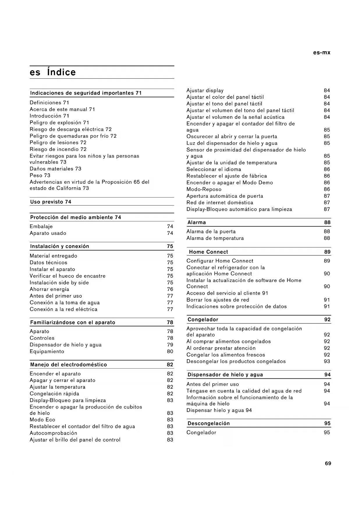 Para volver a conectar el aparato con la red doméstica WLAN (Wi-Fi), ejecute de nuevo la configuración inicial. ~ "Configuración de la conexión con la red doméstica" en la página 89 Indicaciones sobre protección de datos Al conectar por primera vez su aparato Home Connect a una red doméstica asociada a internet WLAN (Wi-Fi), el aparato transmite las siguientes categorías de datos al servidor Home Connect (registro inicial): ▯ Identificación unívoca del aparato (compuesta por la clave del aparato y la dirección MAC del módulo de comunicación Wi-Fi utilizado). ▯ Certificado de seguridad del módulo de comunicación Wi-Fi (para la protección técnica de la información de la conexión). ▯ Las versiones actuales del software y hardware del electrodoméstico. ▯ El estado de un posible restablecimiento previo a los ajustes de fábrica. El registro inicial prepara la utilización de las funciones Home Connect y solo es necesario la primera vez que se vayan a utilizar las funciones Home Connect. Nota: Tenga en cuenta que las funciones Home Connect solo se pueden utilizar en conexión con la aplicación Home Connect. Se puede consultar la información relativa a la protección de datos en la aplicación Home Connect.92 es-mx Congelador