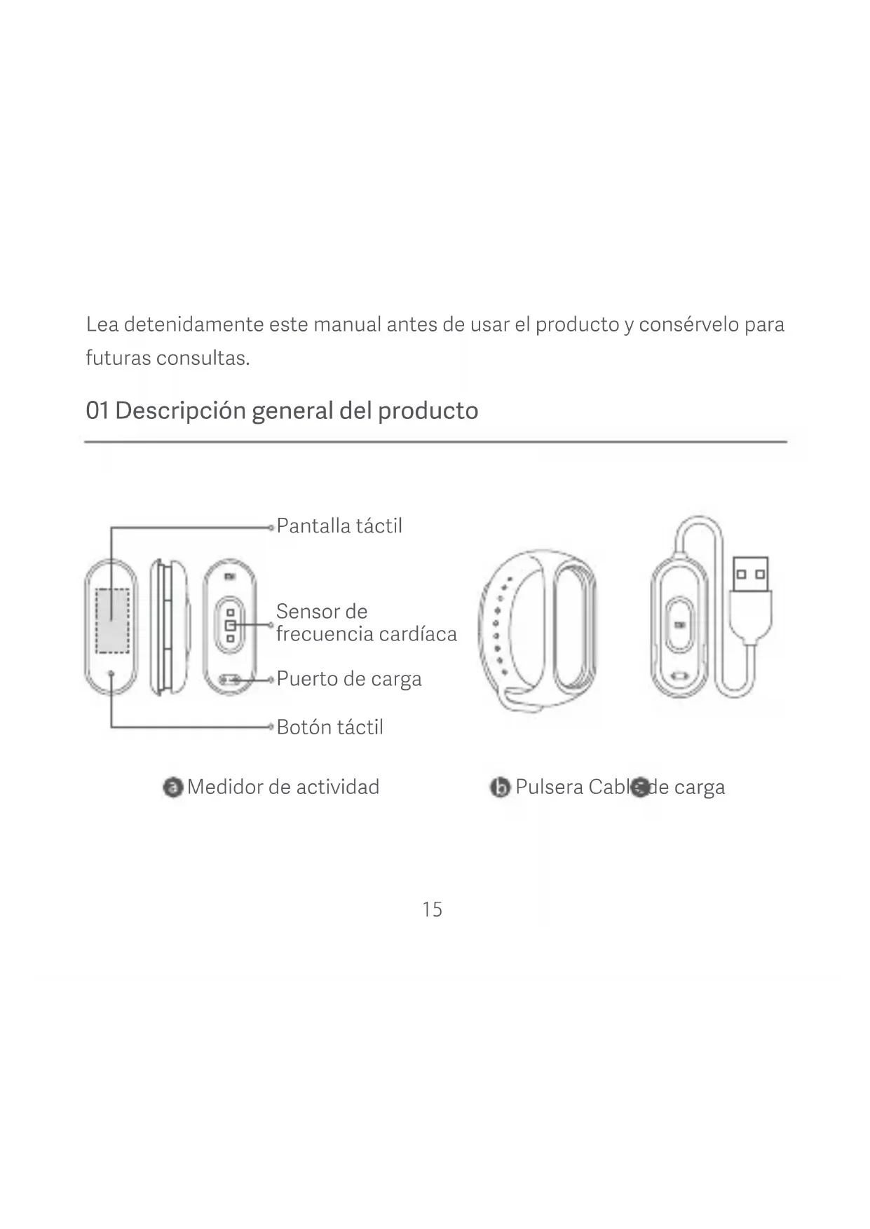 Pulsera Cable de carga Medidor de actividad Pantalla táctil Botón táctil Sensor de frecuencia cardíaca Puerto de carga16 02 Instalación