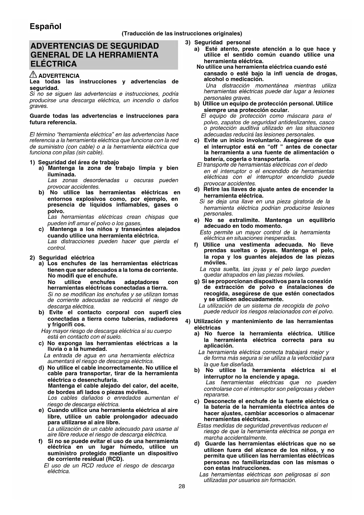 ELÉCTRICA ADVERTENCIA Lea todas las instrucciones y advertencias de seguridad. Si no se siguen las advertencias e instrucciones, podría producirse una descarga eléctrica, un incendio o daños graves. Guarde todas las advertencias e instrucciones para futura referencia. El término “herramienta eléctrica” en las advertencias hace referencia a la herramienta eléctrica que funciona con la red de suministro (con cable) o a la herramienta eléctrica que funciona con pilas (sin cable).