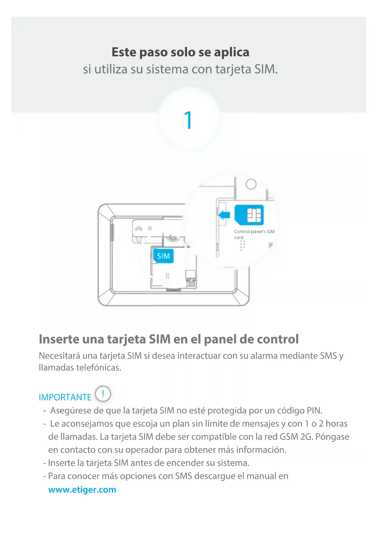 Esto no es un manual complete, sino una guía de inizio=rápido. Para más funcionalidades y la instalación de SMS y de la aplicación, descárguese el manual en www.etiger.com