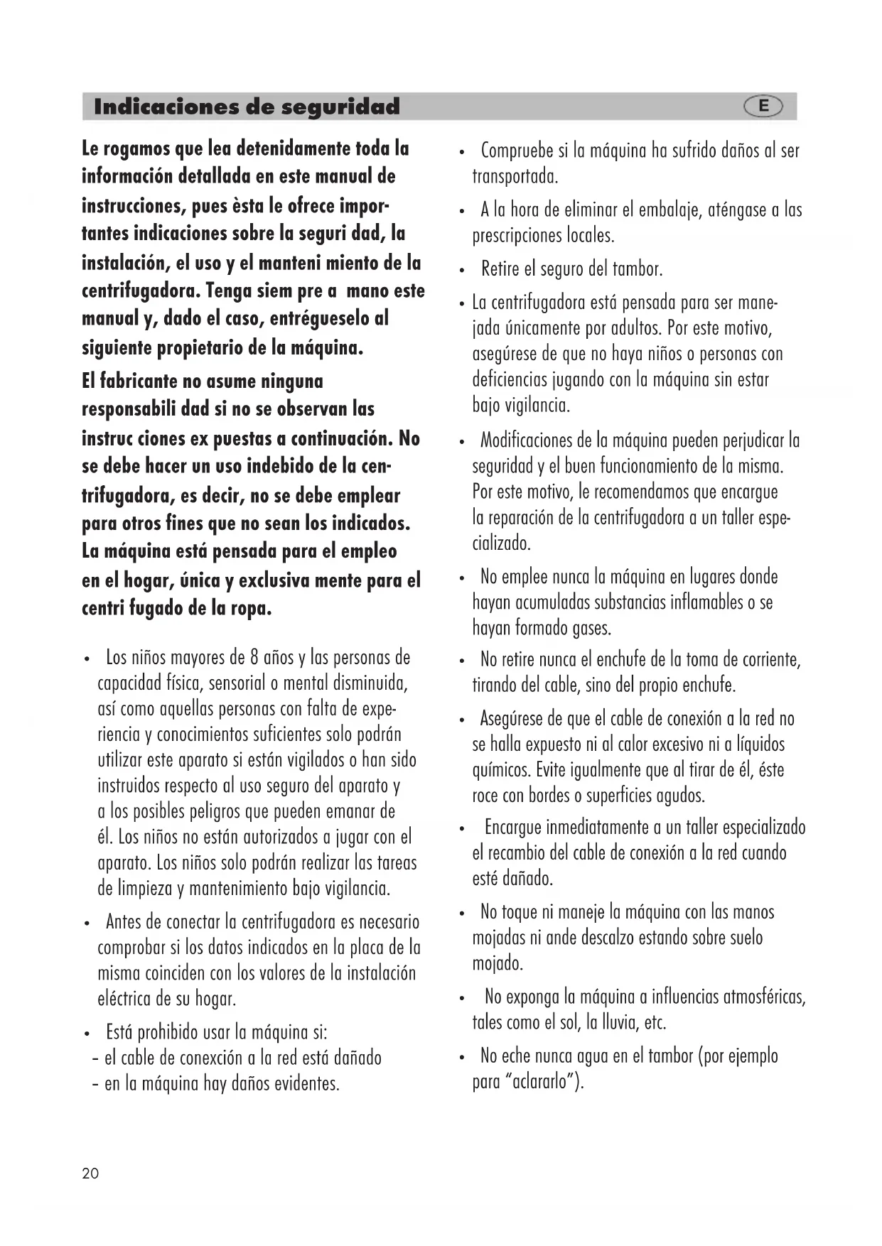 - La centrifugadora está pensada para ser mane- jada únicamente por adultos. Por este motivo, asegúrese de que no haya niños o personas con deficiencias jugando con la máquina sin estar bajo vigilancia.