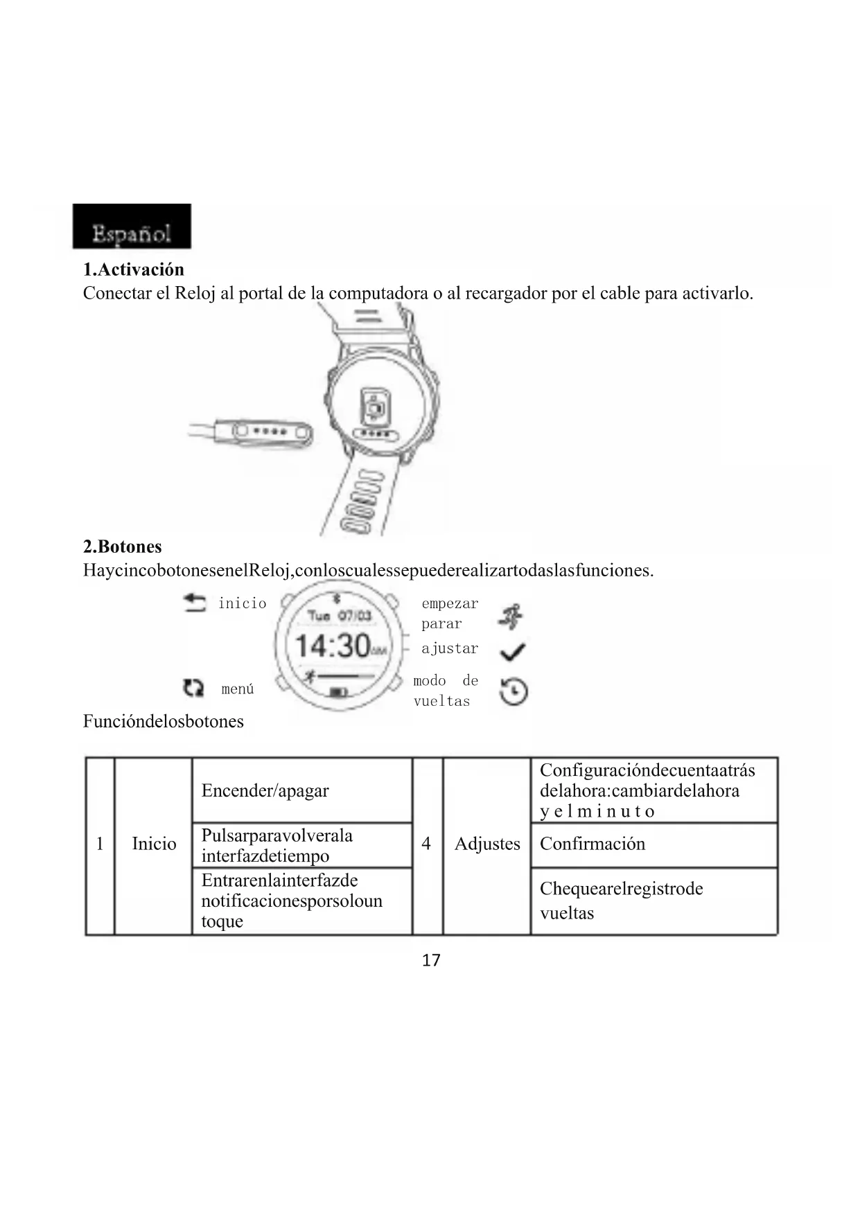 Adjustes Configuración de cuenta atrás de la hora: cambiar de la hora yelminuto Pulsar para volver a la interfaz de tiempo Confirmación Entrar en la interfaz de notificaciones por solo un toque Chequear el registro de vueltas inicio menú empezar parar ajustar modo de vueltas18 3.Explorar las interfaces principales Pulsar el botón [menú] para ver las interfacesprincipales por turno. 4.Introducción de las funciones En la interfaz de tiempo se puede chequear la fecha, la hora actuales y el estado de Retroiluminación Confirmación de cámara de control remoto