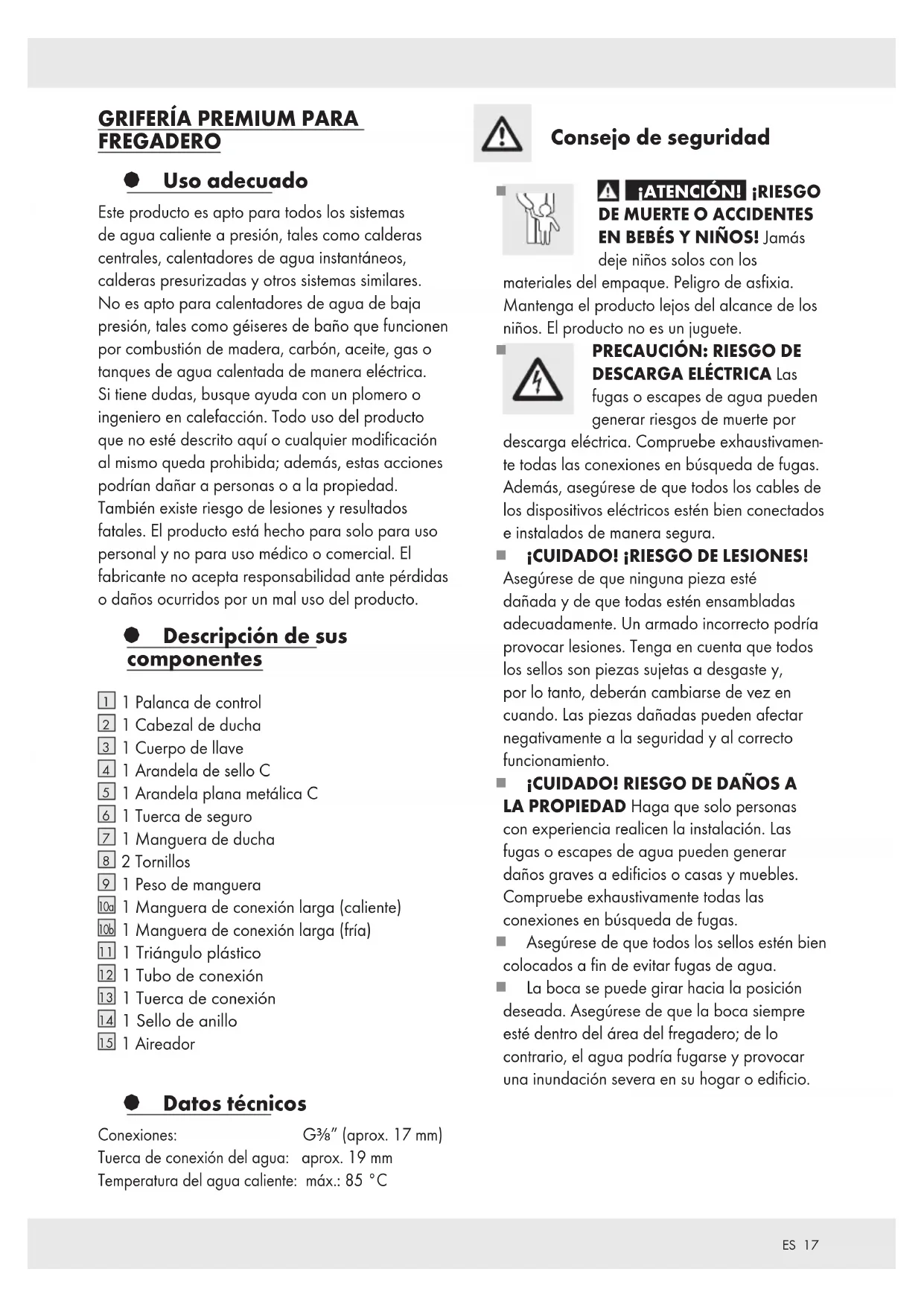 en todas las posiciones posibles. Compruebe regularmente todas las conexiones a fin de garantizar que estén apretadas. § Cuidado y limpieza § Cuidado y limpieza de la llave Tenga en cuenta que todas las conexiones sanitarias requieren especial atención y cuidado. Por lo tanto, debe seguir el siguiente consejo: Jamás utilice materiales corrosivos o con base de alcohol para limpiar, ya que esto puede dañar el producto. Limpie las conexiones con agua limpiar, con un detergente suave y con un paño suave o de cuero. Saque el aireador