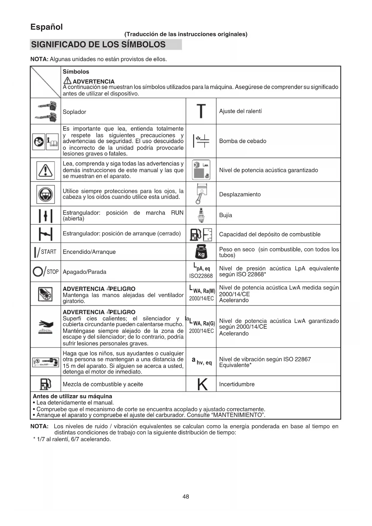 NOTA: Algunas unidades no están provistos de ellos. Símbolos ADVERTENCIA A continuación se muestran los símbolos utilizados para la máquina. Asegúrese de comprender su signifi cado antes de utilizar el dispositivo. Soplador Ajuste del ralentí Es importante que lea, entienda totalmente y respete las siguientes precauciones y advertencias de seguridad. El uso descuidado o incorrecto de la unidad podría provocarle lesiones graves o fatales. Bomba de cebado Lea, comprenda y siga todas las advertencias y demás instrucciones de este manual y las que se muestran en el aparato. Nivel de potencia acústica garantizado Utilice siempre protecciones para los ojos, la cabeza y los oídos cuando utilice esta unidad. Desplazamiento Estrangulador: posición de marcha RUN (abierta) Bujía Estrangulador: posición de arranque (cerrado) Capacidad del depósito de combustible START Encendido/Arranque Peso en seco (sin combustible, con todos los tubos) STOP Apagado/Parada