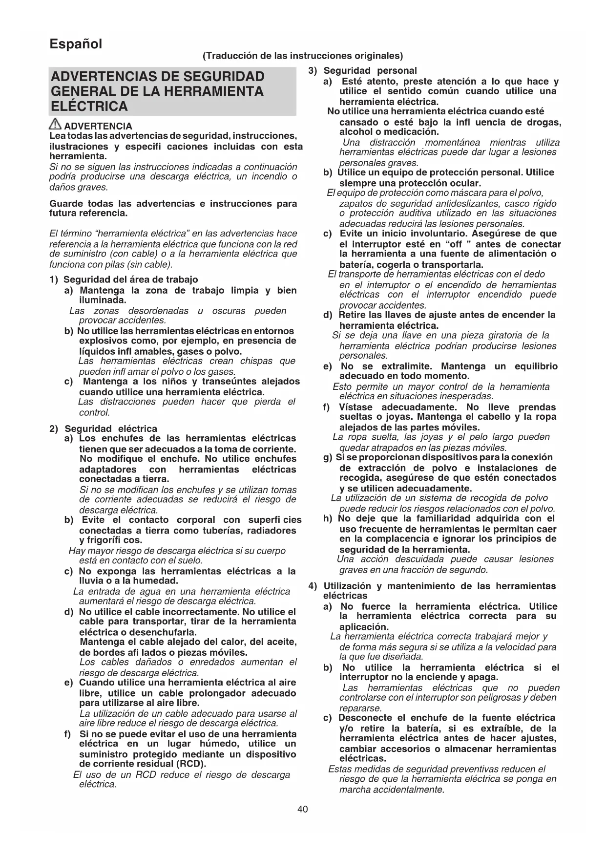 ELÉCTRICA ADVERTENCIA Lea todas las advertencias de seguridad, instrucciones, ilustraciones y especifi caciones incluidas con esta herramienta. Si no se siguen las instrucciones indicadas a continuación podría producirse una descarga eléctrica, un incendio o daños graves. Guarde todas las advertencias e instrucciones para futura referencia. El término “herramienta eléctrica” en las advertencias hace referencia a la herramienta eléctrica que funciona con la red de suministro (con cable) o a la herramienta eléctrica que funciona con pilas (sin cable).