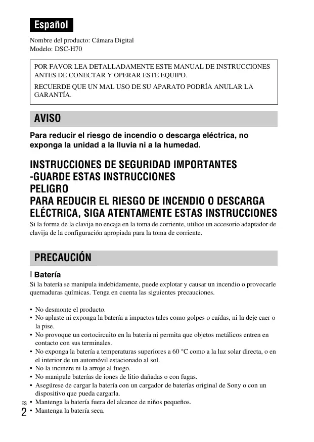 Manopola del modo Español Nombre del producto: Cámara Digital Modelo: DSC-H70 POR FAVOR LEA DETALLADAMENTE ESTE MANUAL DE INSTRUCCIONES ANTES DE CONECTAR Y OPERAR ESTE EQUIPO. RECUERDE QUE UN MAL USO DE SU APARATO PODRÍA ANULAR LA GARANTÍA. AVISO Para reducir el riesgo de incendio o descarga eléctrica, no exponga la unidad a la lluvia ni a la humedad.