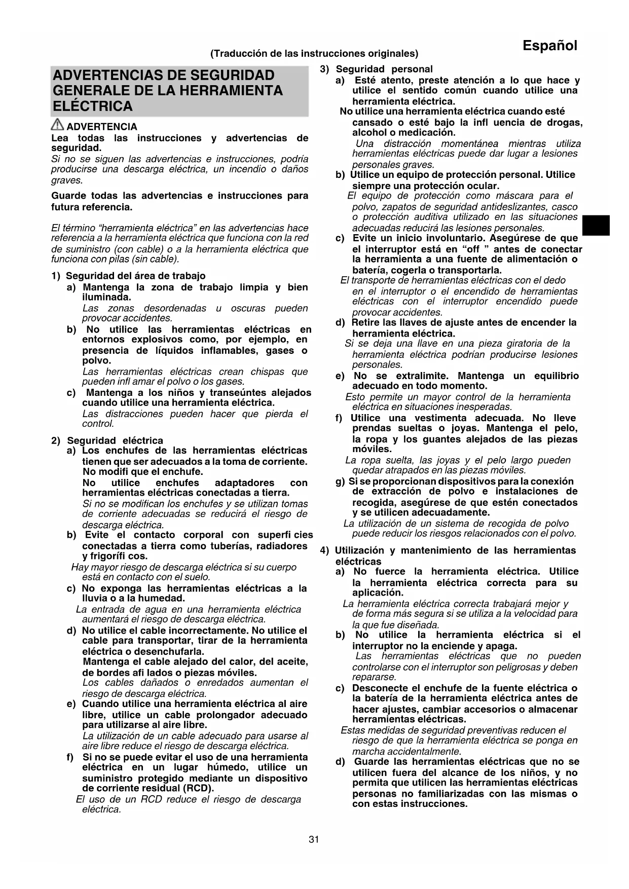 ELÉCTRICA ADVERTENCIA Lea todas las instrucciones y advertencias de seguridad. Si no se siguen las advertencias e instrucciones, podría producirse una descarga eléctrica, un incendio o daños graves. Guarde todas las advertencias e instrucciones para futura referencia. El término “herramienta eléctrica” en las advertencias hace referencia a la herramienta eléctrica que funciona con la red de suministro (con cable) o a la herramienta eléctrica que funciona con pilas (sin cable).