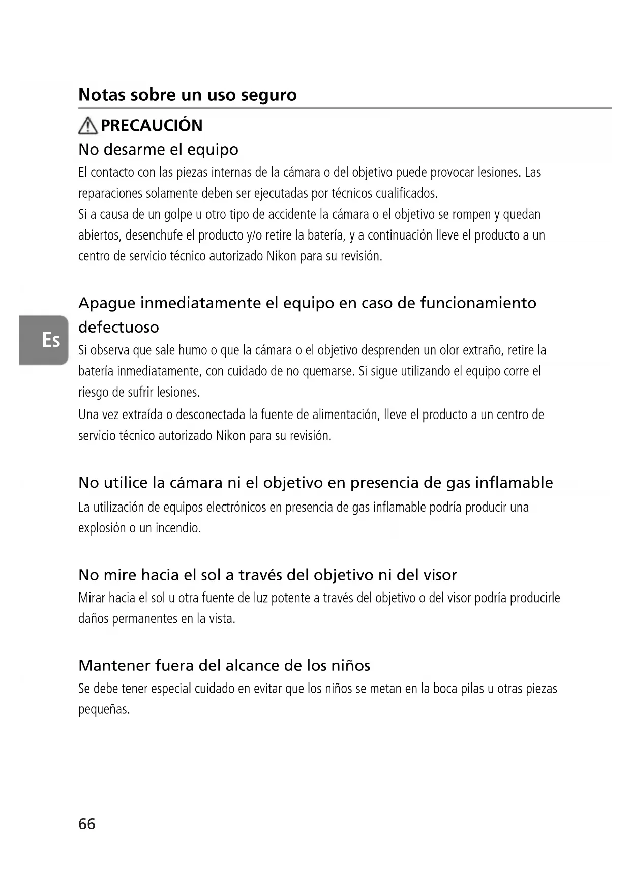 No desarme el equipo El contacto con las piezas internas de la cámara o del objetivo puede provocar lesiones. Las reparaciones solamente deben ser ejecutadas por técnicos cualificados. Si a causa de un golpe u otro tipo de accidente la cámara o el objetivo se rompen y quedan abiertos, desenchufe el producto y/o retire la batería, y a continuación lleve el producto a un centro de servicio técnico autorizado Nikon para su revisión. Apague inmediatamente el equipo en caso de funcionamiento defectuoso Si observa que sale humo o que la cámara o el objetivo desprenden un olor extraño, retire la batería inmediatamente, con cuidado de no quemarse. Si sigue utilizando el equipo corre el riesgo de sufrir lesiones. Una vez extraída o desconectada la fuente de alimentación, lleve el producto a un centro de servicio técnico autorizado Nikon para su revisión. No utilice la cámara ni el objetivo en presencia de gas inflamable La utilización de equipos electrónicos en presencia de gas inflamable podría producir una explosión o un incendio. No mire hacia el sol a través del objetivo ni del visor Mirar hacia el sol u otra fuente de luz potente a través del objetivo o del visor podría producirle daños permanentes en la vista. Mantener fuera del alcance de los niños Se debe tener especial cuidado en evitar que los niños se metan en la boca pilas u otras piezas pequeñas. Notas sobre un uso seguro PRECAUCIÓN67