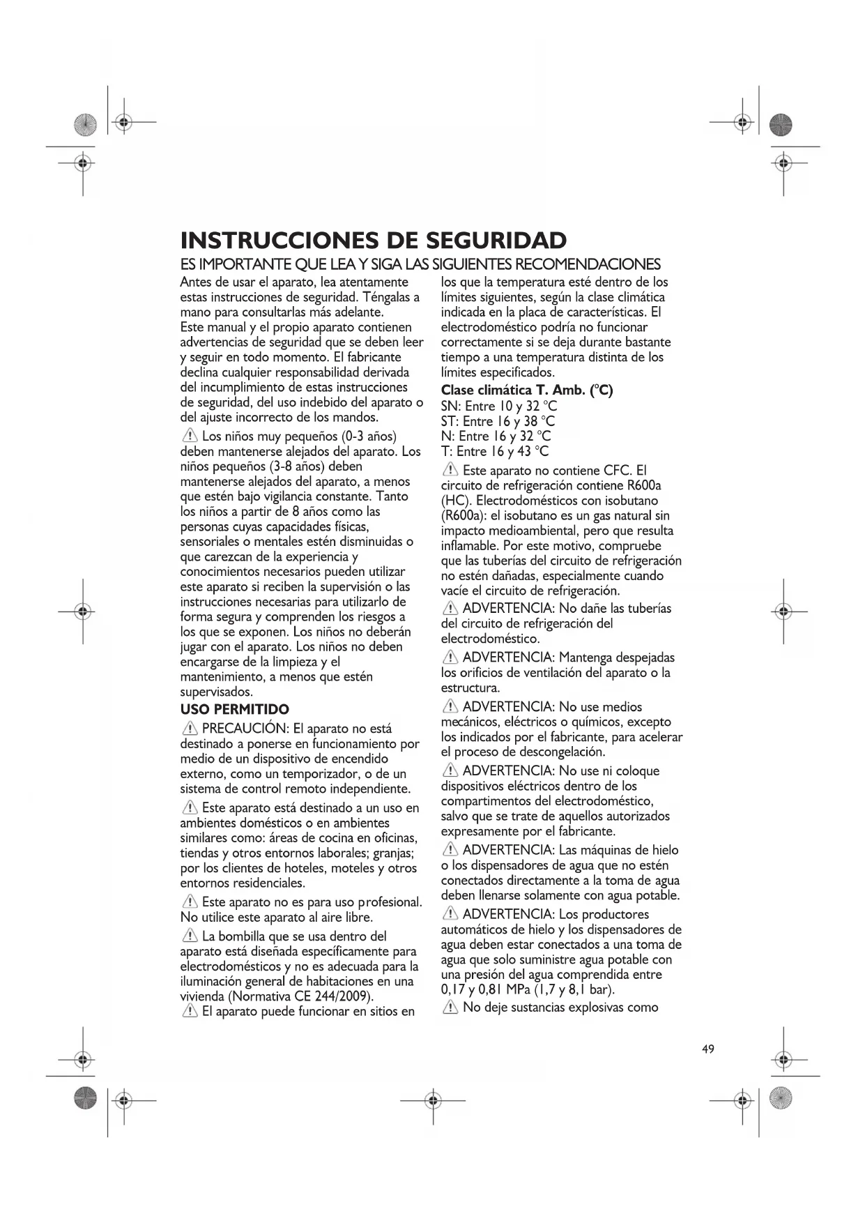 ES IMPORTANTE QUE LEA Y SIGA LAS SIGUIENTES RECOMENDACIONES Antes de usar el aparato, lea atentamente estas instrucciones de seguridad. Téngalas a mano para consultarlas más adelante. Este manual y el propio aparato contienen advertencias de seguridad que se deben leer y seguir en todo momento. El fabricante declina cualquier responsabilidad derivada del incumplimiento de estas instrucciones de seguridad, del uso indebido del aparato o del ajuste incorrecto de los mandos. Los niños muy pequeños (0-3 años) deben mantenerse alejados del aparato. Los niños pequeños (3-8 años) deben mantenerse alejados del aparato, a menos que estén bajo vigilancia constante. Tanto los niños a partir de 8 años como las personas cuyas capacidades físicas, sensoriales o mentales estén disminuidas o que carezcan de la experiencia y conocimientos necesarios pueden utilizar este aparato si reciben la supervisión o las instrucciones necesarias para utilizarlo de forma segura y comprenden los riesgos a los que se exponen. Los niños no deberán jugar con el aparato. Los niños no deben encargarse de la limpieza y el mantenimiento, a menos que estén supervisados. USO PERMITIDO PRECAUCIÓN: El aparato no está destinado a ponerse en funcionamiento por medio de un dispositivo de encendido externo, como un temporizador, o de un sistema de control remoto independiente. Este aparato está destinado a un uso en ambientes domésticos o en ambientes similares como: áreas de cocina en oficinas, tiendas y otros entornos laborales; granjas; por los clientes de hoteles, moteles y otros entornos residenciales. Este aparato no es para us o p rofesional. No utilice este aparato al aire libre. La bombilla que se usa dentro del aparato está diseñada específicamente para electrodomésticos y no es adecuada para la iluminación general de habitaciones en una vivienda (Normativa CE 244/2009). El aparato puede funcionar en sitios en los que la temperatura esté dentro de los límites siguientes, según la clase climática indicada en la placa de características. El electrodoméstico podría no funcionar correctamente si se deja durante bastante tiempo a una temperatura distinta de los límites especificados. Clase climática T. Amb. (°C) SN: Entre 10 y 32 °C ST: Entre 16 y 38 °C N: Entre 16 y 32 °C T: Entre 16 y 43 °C Este aparato no contiene CFC. El circuito de refrigeración contiene R600a (HC). Electrodomésticos con isobutano (R600a): el isobutano es un gas natural sin impacto medioambiental, pero que resulta inflamable. Por este motivo, compruebe que las tuberías del circuito de refrigeración no estén dañadas, especialmente cuando vacíe el circuito de refrigeración. ADVERTENCIA: No dañe las tuberías del circuito de refrigeración del electrodoméstico. ADVERTENCIA: Mantenga despejadas los orificios de ventilación del aparato o la estructura. ADVERTENCIA: No use medios