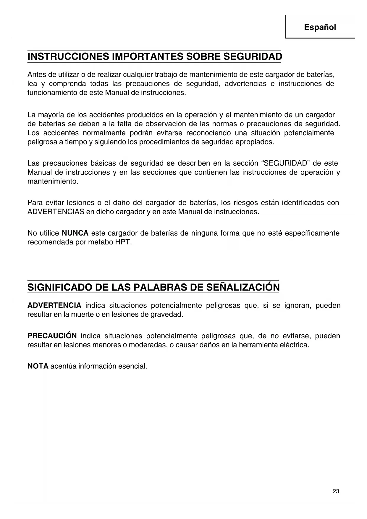 Français 000UC18YFSLUSmetabo.indb22000UC18YFSLUSmetabo.indb22 2019/12/2511:02:332019/12/2511:02:33INSTRUCCIONES IMPORTANTES SOBRE SEGURIDAD Antes de utilizar o de realizar cualquier trabajo de mantenimiento de este cargador de baterías, lea y comprenda todas las precauciones de seguridad, advertencias e instrucciones de funcionamiento de este Manual de instrucciones. La mayoría de los accidentes producidos en la operación y el mantenimiento de un cargador de baterías se deben a la falta de observación de las normas o precauciones de seguridad. Los accidentes normalmente podrán evitarse reconociendo una situación potencialmente peligrosa a tiempo y siguiendo los procedimientos de seguridad apropiados. Las precauciones básicas de seguridad se describen en la sección “SEGURIDAD” de este Manual de instrucciones y en las secciones que contienen las instrucciones de operación y mantenimiento. Para evitar lesiones o el daño del cargador de baterías, los riesgos están identifi cados con ADVERTENCIAS en dicho cargador y en este Manual de instrucciones. No utilice NUNCA este cargador de baterías de ninguna forma que no esté específi camente recomendada por metabo HPT. SIGNIFICADO DE LAS PALABRAS DE SEÑALIZACIÓN ADVERTENCIA indica situaciones potencialmente peligrosas que, si se ignoran, pueden resultar en la muerte o en lesiones de gravedad. PRECAUCIÓN indica situaciones potencialmente peligrosas que, de no evitarse, pueden resultar en lesiones menores o moderadas, o causar daños en la herramienta eléctrica. NOTA acentúa información esencial.