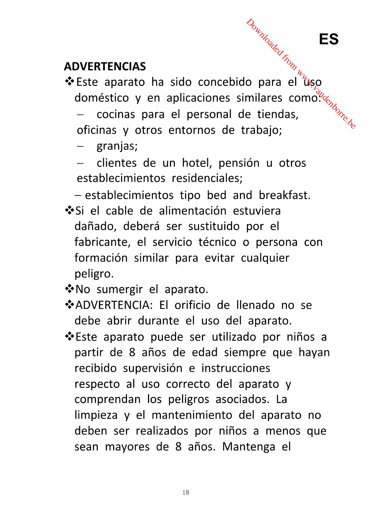 Downloaded from www.vandenborre.beaparato y su cable eléctrico fuera del alcance de niños menores de 8 años.