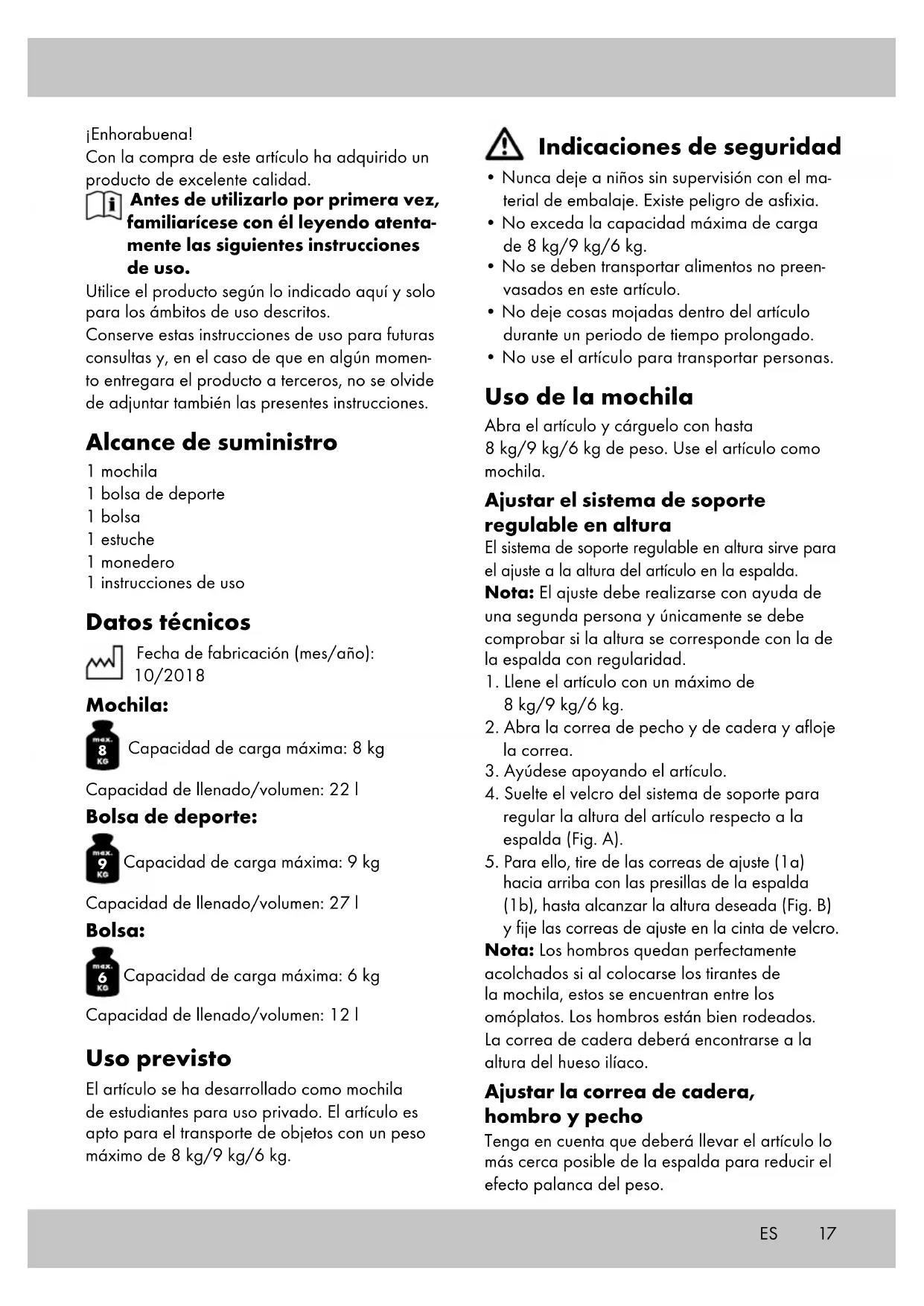 Capacidad de carga máxima: 6 kg Capacidad de llenado/volumen: 12 l Uso previsto El artículo se ha desarrollado como mochila de estudiantes para uso privado. El artículo es apto para el transporte de objetos con un peso máximo de 8 kg/9 kg/6 kg. Indicaciones de seguridad