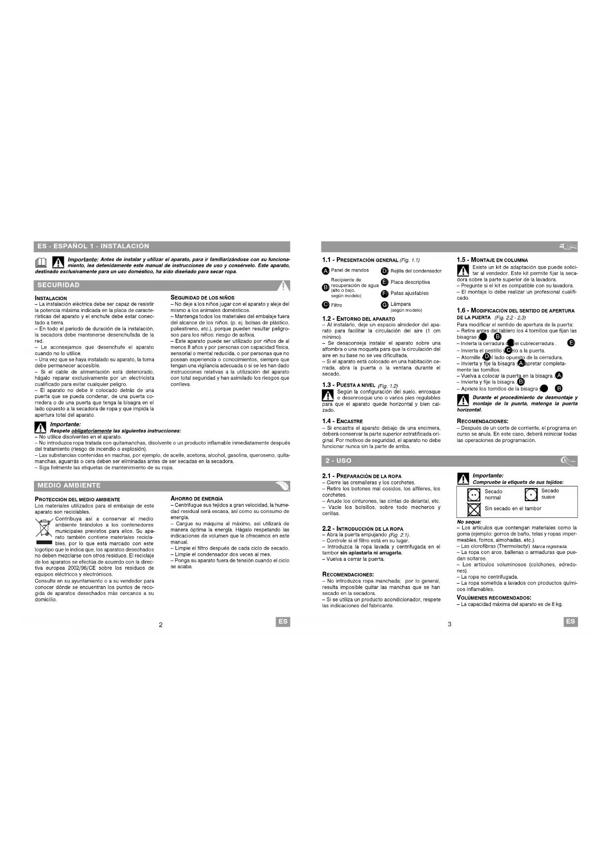 Importante: Antes de instalar y utilizar el aparato, para ir familiarizándose con su funciona- miento, lea detenidamente este manual de instrucciones de uso y consérvelo. Este aparato, destinado exclusivamente para un uso doméstico, ha sido diseñado para secar ropa. SECURIDAD INSTALACIÓN — La instalación eléctrica debe ser capaz de resistir la potencia máxima indicada en la placa de caracte- rísticas del aparato y el enchufe debe estar conec- tado a tierra. — En todo el periodo de duración de la instalación, la secadora debe mantenerse desenchufada de la red. — Le aconsejamos que desenchufe el aparato cuando no lo utilice. — Una vez que se haya instalado su aparato, la toma debe permanecer accesible. — Si el cable de alimentación está deteriorado, hágalo reparar exclusivamente por un electricista cualificado para evitar cualquier peligro. — El aparato no debe ir colocado detrás de una puerta que se pueda condenar, de una puerta co- rredera o de una puerta que tenga la bisagra en el lado opuesto a la secadora de ropa y que impida la apertura total del aparato. MEDIO AMBIENTE