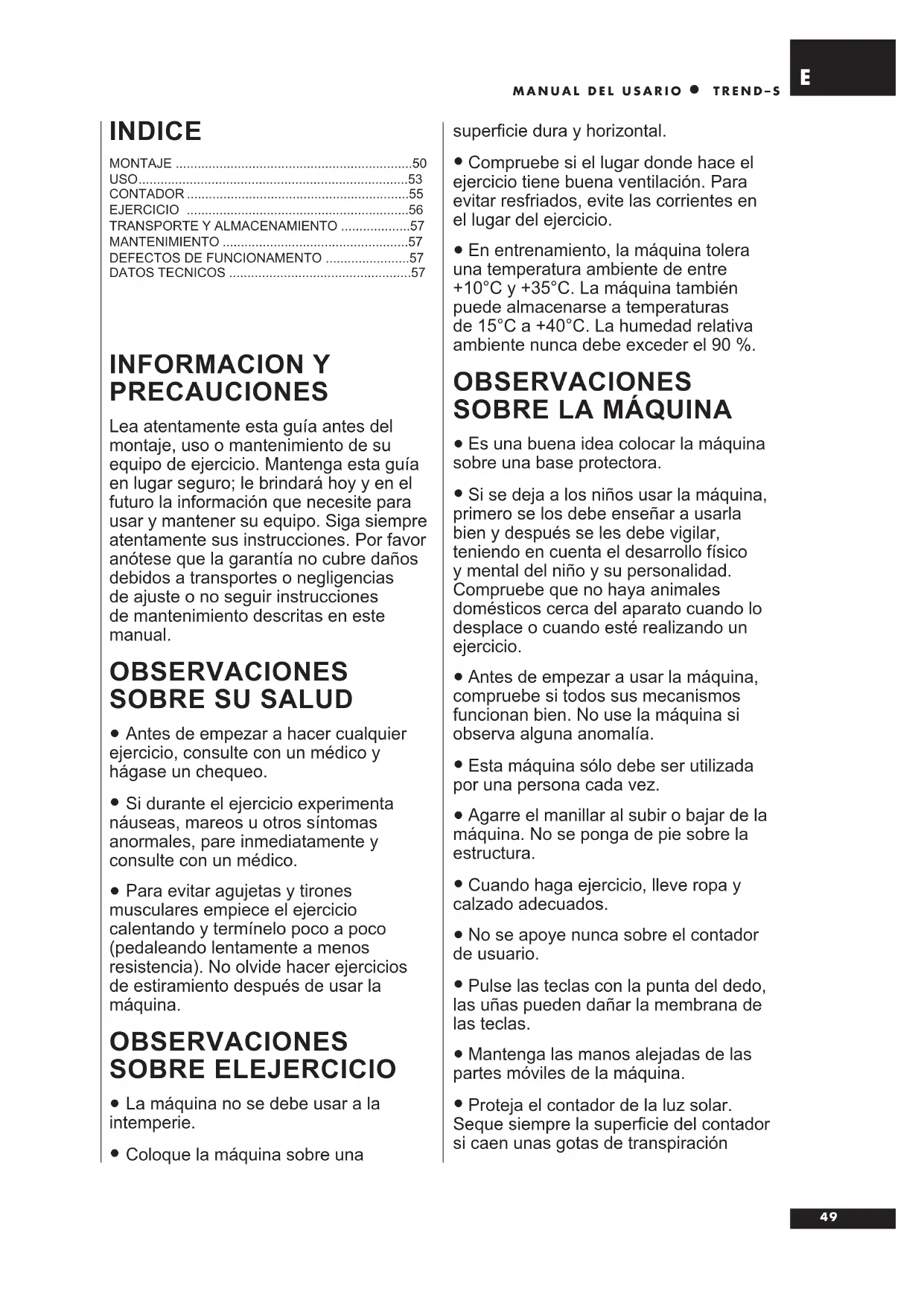 TREND–S INFORMACION Y PRECAUCIONES Lea atentamente esta guía antes del montaje, uso o mantenimiento de su equipo de ejercicio. Mantenga esta guía en lugar seguro; le brindará hoy y en el futuro la información que necesite para usar y mantener su equipo. Siga siempre atentamente sus instrucciones. Por favor anótese que la garantía no cubre daños debidos a transportes o negligencias de ajuste o no seguir instrucciones de mantenimiento descritas en este manual. OBSERVACIONES