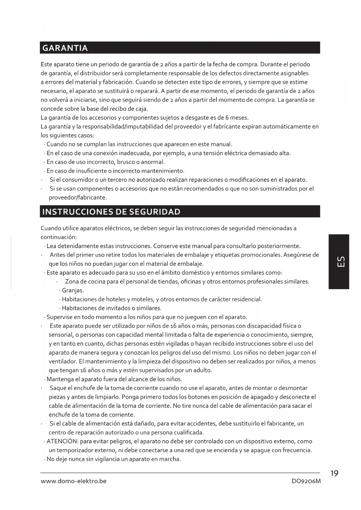 DIRECTRICES MEDIOAMBIENTALES El símbolo en el producto o en el embalaje indica que este producto no puede ser tratado como residuo doméstico. Se debe llevar a un lugar en el que se reciclan equipos eléctricos y electrónicos. Si se asegura de que este producto se desecha correctamente, usted ayudará a evitar posibles consecuencias negativas para las personas y el medio ambiente que serían causadospor un tratamiento de residuos inadecuado. Para obtener información más detallada sobre el reciclaje de este producto, póngase en contacto con su ayuntamiento, o con la empresa o departamento responsable del servicio de recogida de basura doméstica, o con la tienda donde adquirió el producto. El material de embalaje es reciclable. Trate el embalaje de una manera medioambientalmente responsable.23 DO9206M www.domo-elektro.be