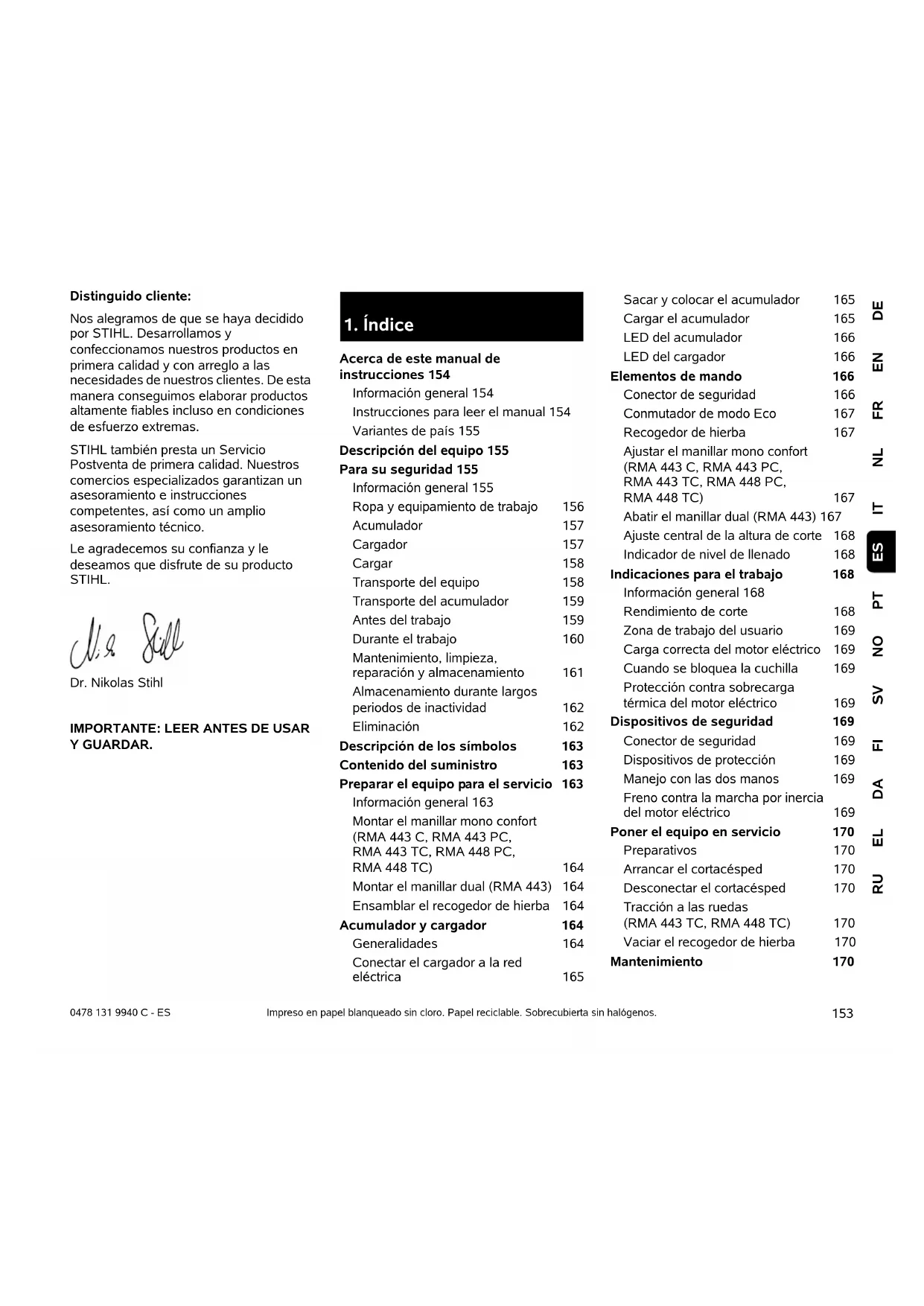 DEENFRNLITPTNOSVFIDAELRU ES 0478 131 9940 C - ES Distinguido cliente: Nos alegramos de que se haya decidido por STIHL. Desarrollamos y confeccionamos nuestros productos en primera calidad y con arreglo a las necesidades de nuestros clientes. De esta manera conseguimos elaborar productos altamente fiables incluso en condiciones de esfuerzo extremas. STIHL también presta un Servicio Postventa de primera calidad. Nuestros comercios especializados garantizan un asesoramiento e instrucciones competentes, así como un amplio asesoramiento técnico. Le agradecemos su confianza y le deseamos que disfrute de su producto STIHL. Dr. Nikolas Stihl
