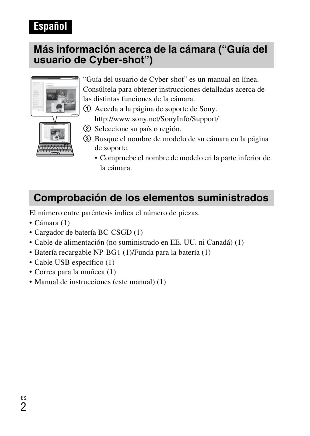 Español Más información acerca de la cámara (“Guía del usuario de Cyber-shot”) “Guía del usuario de Cyber-shot” es un manual en línea. Consúltela para obtener instrucciones detalladas acerca de las distintas funciones de la cámara. 1 Acceda a la página de soporte de Sony. http://www.sony.net/SonyInfo/Support/ 2 Seleccione su país o región. 3 Busque el nombre de modelo de su cámara en la página de soporte.