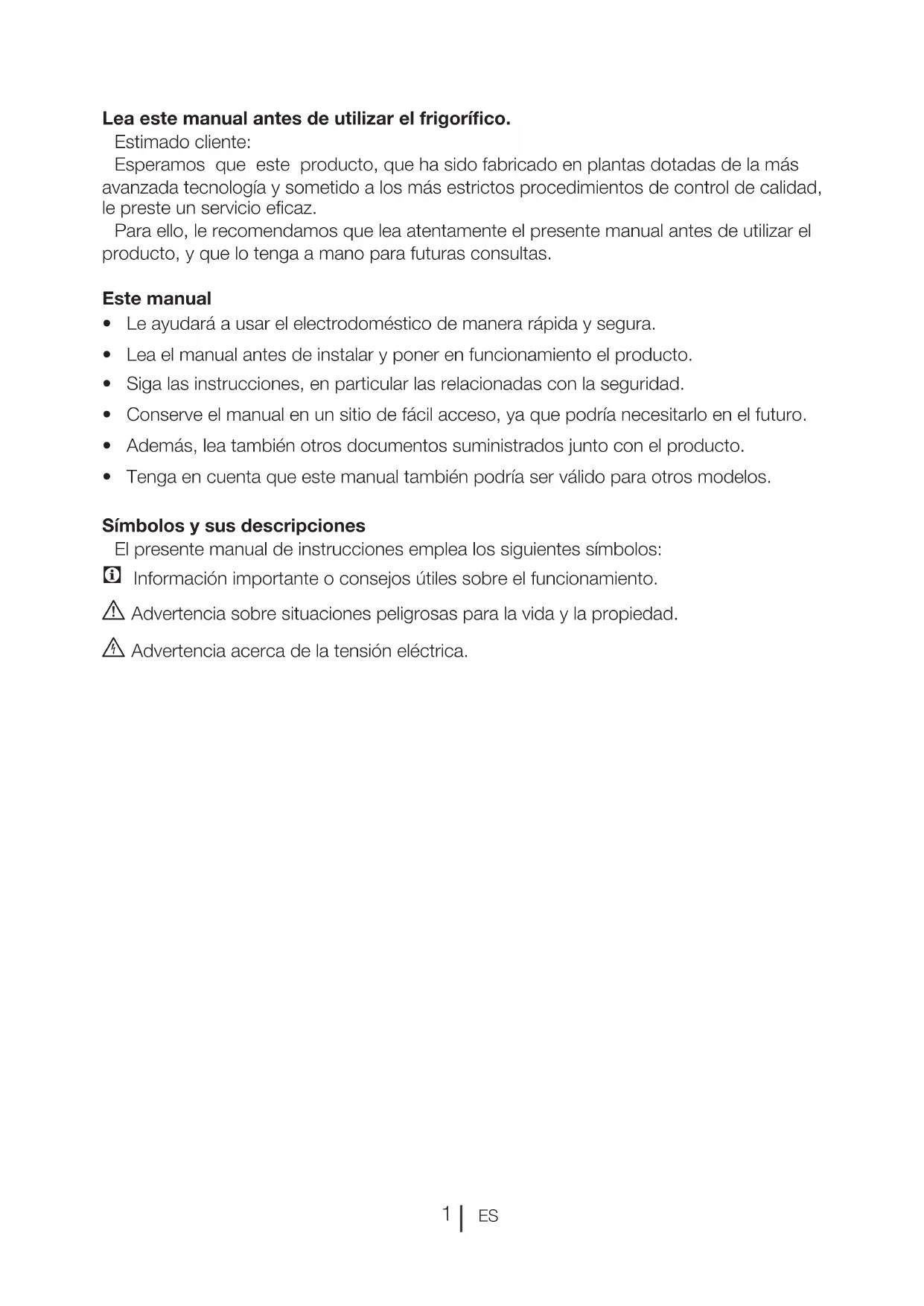 Lea este manual antes de utilizar el frigorífico. Estimado cliente: Esperamos que este producto, que ha sido fabricado en plantas dotadas de la más avanzada tecnología y sometido a los más estrictos procedimientos de control de calidad, le preste un servicio eficaz. Para ello, le recomendamos que lea atentamente el presente manual antes de utilizar el producto, y que lo tenga a mano para futuras consultas. Este manual