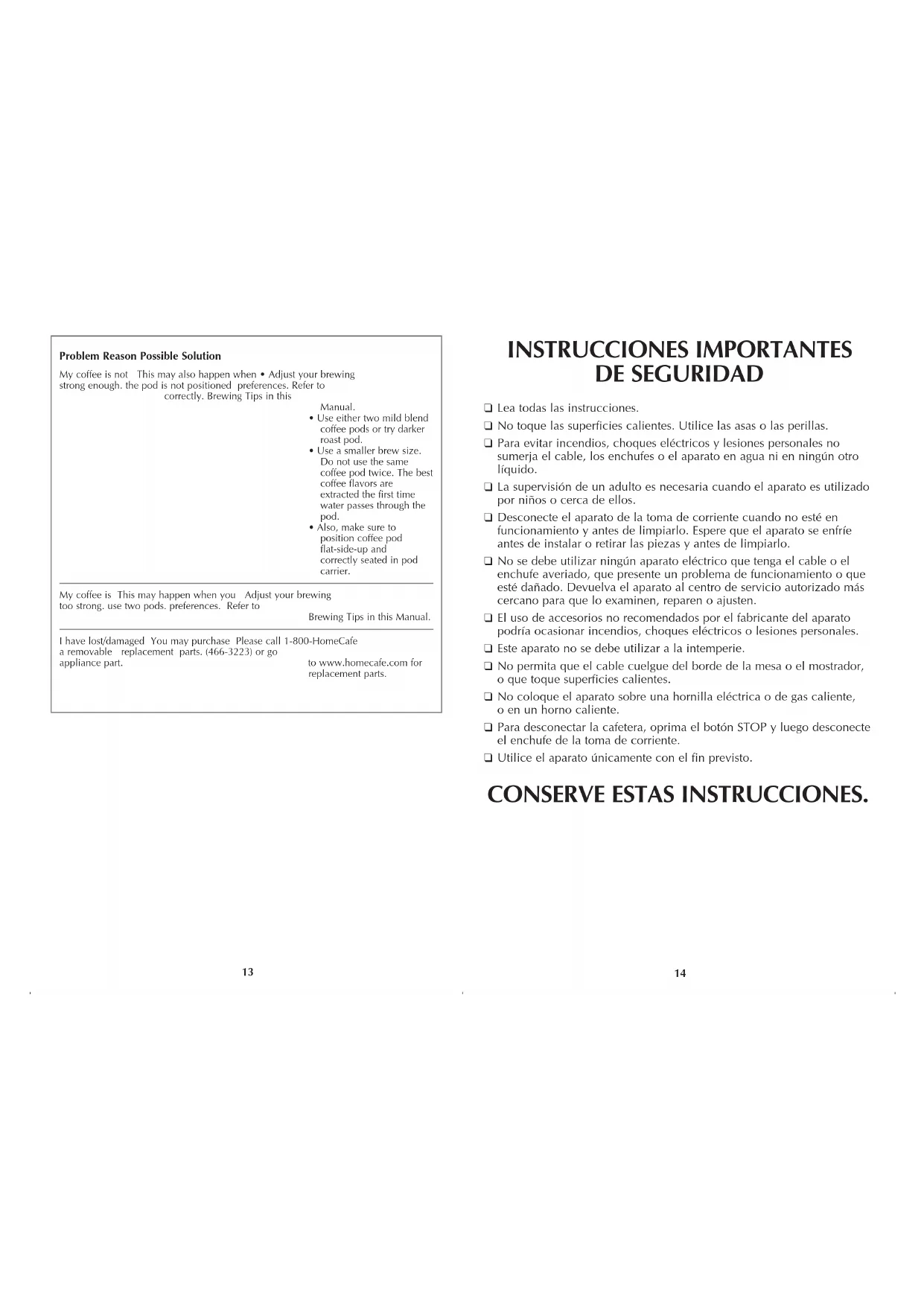 - También asegúrese de que la bolsita quede bien colocada (la parte plana hacia arriba) en el sujetador. El café resulta Esto puede suceder cuando • Ajuste las preferencias de demasiado fuerte. uno utiliza dos bolsitas de café. colado. Consulte los consejos para colar, citados en este manual. Se ha extraviado o • Usted puede comprar y dañado una de las reemplazar las piezas piezas separables separables. del aparato. • Para las piezas de repuesto, por favor llame gratis al 1-800-HomeCafe (466-3223) o visite nuestro sitio web: www.homecafe.com GT300Pub1000001930R3 8/23/06 2:56 PM Page 2628