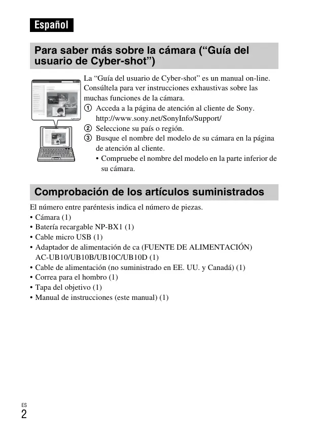 Español Para saber más sobre la cámara (“Guía del usuario de Cyber-shot”) La “Guía del usuario de Cyber-shot” es un manual on-line. Consúltela para ver instrucciones exhaustivas sobre las muchas funciones de la cámara. 1 Acceda a la página de atención al cliente de Sony. http://www.sony.net/SonyInfo/Support/ 2 Seleccione su país o región. 3 Busque el nombre del modelo de su cámara en la página de atención al cliente.