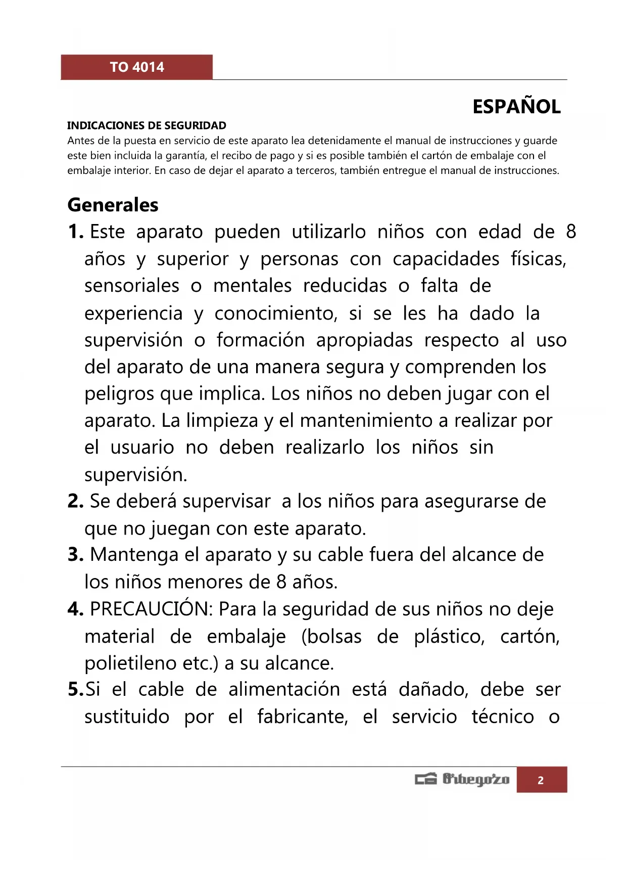 MANUAL DE USUARIO TO 4014 Orbegozo
