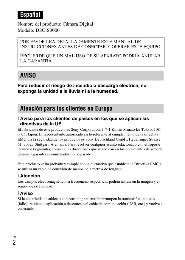 Español Nombre del producto: Cámara Digital Modelo: DSC-S3000 POR FAVOR LEA DETALLADAMENTE ESTE MANUAL DE INSTRUCCIONES ANTES DE CONECTAR Y OPERAR ESTE EQUIPO. RECUERDE QUE UN MAL USO DE SU APARATO PODRÍA ANULAR LA GARANTÍA. AVISO Para reducir el riesgo de incendio o descarga eléctrica, no exponga la unidad a la lluvia ni a la humedad. Atención para los clientes en Europa [ Aviso para los clientes de países en los que se aplican las directivas de la UE El fabricante de este producto es Sony Corporation, 1-7-1 Konan Minato-ku Tokyo, 1080075, Japón. El representante autorizado en lo referente al cumplimiento de la directiva EMC y a la seguridad de los productos es Sony Deutschland GmbH, Hedelfinger Strasse 61, 70327 Stuttgart, Alemania. Para resolver cualquier asunto relacionado con el soporte técnico o la garantía, consulte las direcciones que se indican en los documentos de soporte técnico y garantía suministrados por separado. Este producto se ha probado y cumple con la normativa que establece la Directiva EMC si se utiliza un cable de conexión de menos de 3 metros de longitud. [ Atención Los campos electromagnéticos a frecuencias específicas podrán influir en la imagen y el sonido de esta unidad. [ Aviso Si la electricidad estática o el electromagnetismo interrumpen la transmisíon de datos (fallo), reinicie la aplicación o desconecte el cable de comunicación (USB, etc.) y vuelva a conectarlo.