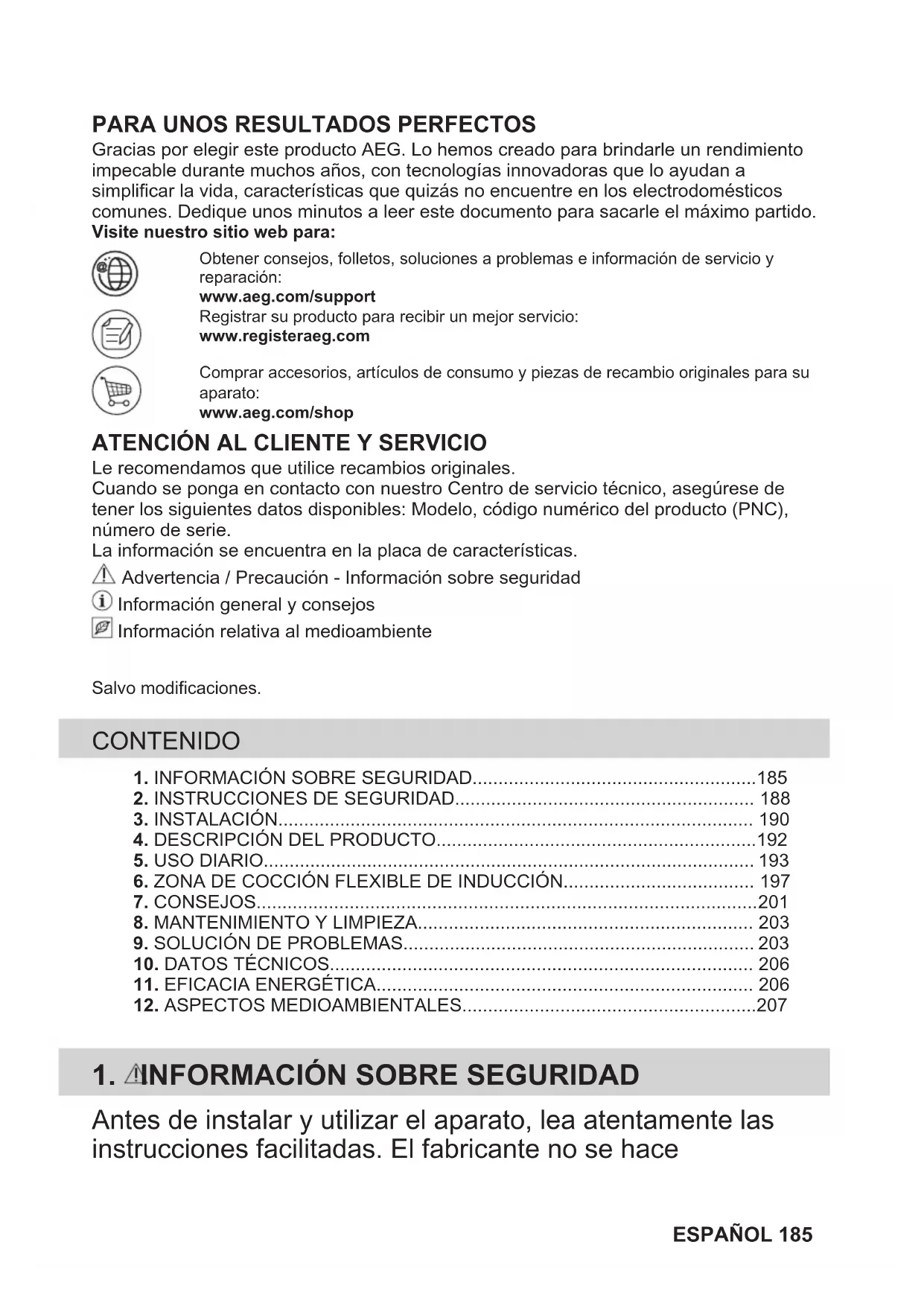 Le recomendamos que utilice recambios originales.Cuando se ponga en contacto con nuestro Centro de servicio técnico, asegúrese detener los siguientes datos disponibles: Modelo, código numérico del producto (PNC),número de serie.La información se encuentra en la placa de características. Advertencia / Precaución - Información sobre seguridad Información general y consejos Información relativa al medioambienteSalvo modificaciones. CONTENIDO 1. INFORMACIÓN SOBRE SEGURIDAD.......................................................1852. INSTRUCCIONES DE SEGURIDAD.......................................................... 188