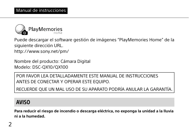 Manual de instrucciones Puede descargar el software gestión de imágenes “PlayMemories Home” de la siguiente dirección URL. http://www.sony.net/pm/ Nombre del producto: Cámara Digital Modelo: DSC-QX10/QX100 POR FAVOR LEA DETALLADAMENTE ESTE MANUAL DE INSTRUCCIONES ANTES DE CONECTAR Y OPERAR ESTE EQUIPO. RECUERDE QUE UN MAL USO DE SU APARATO PODRÍA ANULAR LA GARANTÍA. AVISO Para reducir el riesgo de incendio o descarga eléctrica, no exponga la unidad a la lluvia ni a la humedad.