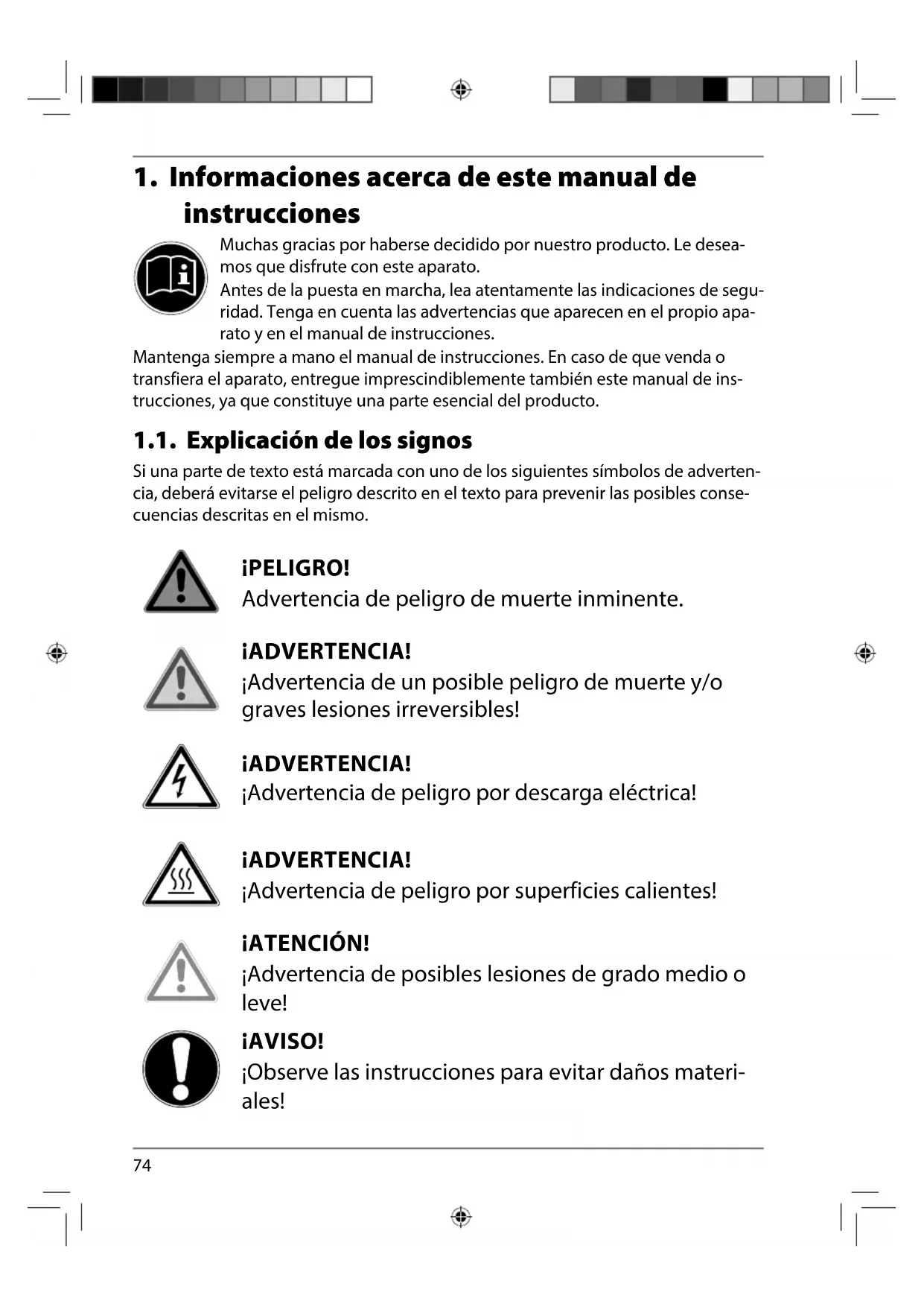 instrucciones Muchas gracias por haberse decidido por nuestro producto. Le desea- mos que disfrute con este aparato. Antes de la puesta en marcha, lea atentamente las indicaciones de segu- ridad. Tenga en cuenta las advertencias que aparecen en el propio apa- rato y en el manual de instrucciones. Mantenga siempre a mano el manual de instrucciones. En caso de que venda o transfiera el aparato, entregue imprescindiblemente también este manual de ins- trucciones, ya que constituye una parte esencial del producto. 1.1. Explicación de los signos Si una parte de texto está marcada con uno de los siguientes símbolos de adverten- cia, deberá evitarse el peligro descrito en el texto para prevenir las posibles conse- cuencias descritas en el mismo. ¡PELIGRO! Advertencia de peligro de muerte inminente. ¡ADVERTENCIA! ¡Advertencia de un posible peligro de muerte y/o graves lesiones irreversibles! ¡ADVERTENCIA! ¡Advertencia de peligro por descarga eléctrica! ¡ADVERTENCIA! ¡Advertencia de peligro por superficies calientes! ¡ATENCIÓN! ¡Advertencia de posibles lesiones de grado medio o leve! ¡AVISO! ¡Observe las instrucciones para evitar daños materi- ales!DE