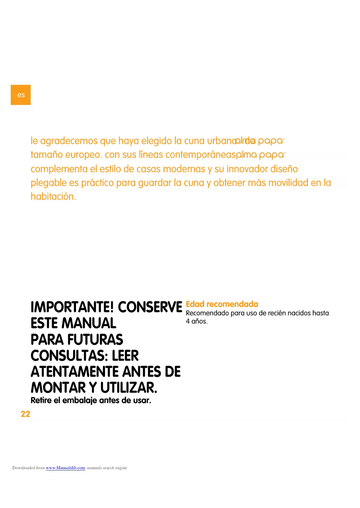 le agradecemos que haya elegido la cuna urbana de tamaño europeo. con sus líneas contemporáneas, complementa el estilo de casas modernas y su innovador diseño plegable es práctico para guardar la cuna y obtener más movilidad en la habitación. Edad recomendada Recomendado para uso de recién nacidos hasta 4 años. IMPORTANTE! CONSERVE ESTE MANUAL PARA FUTURAS CONSULTAS: LEER