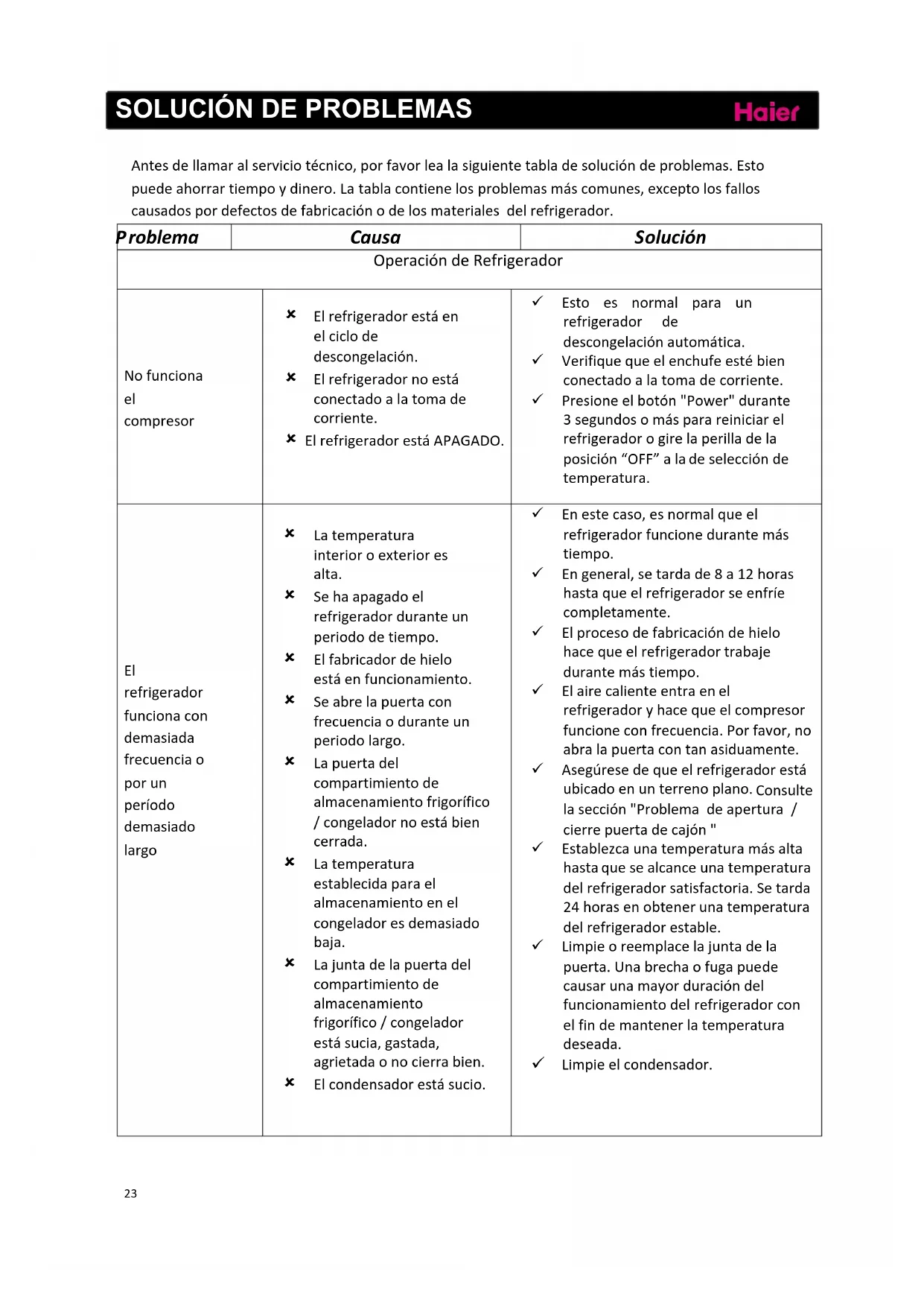 SOLUCIONDEPROBLEMAS Antesdellamaralserviciotécnico,porfavorlealasiguientetabladesolucióndeproblemas.Esto puedeahorrartiempoydinero.Latablacontienelosproblemasmáscomunes,exceptolosfallos causadospordefectosdefabricaciónodelosmaterialesdelrefrigerador.
