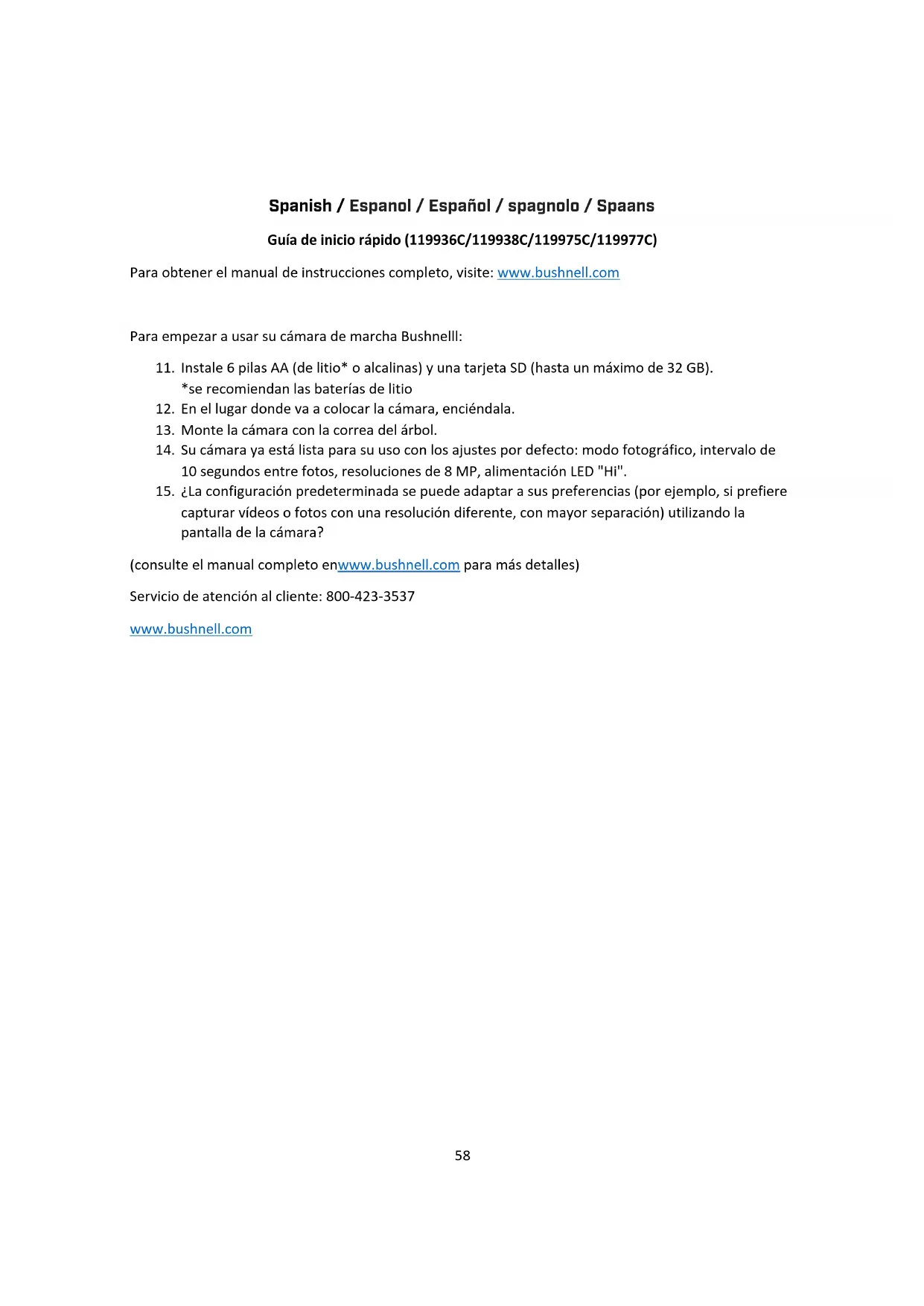 Guía de inicio rápido (119936C/119938C/119975C/119977C) Para obtener el manual de instrucciones completo, visite: www.bushnell.com Para empezar a usar su cámara de marcha Bushnelll: