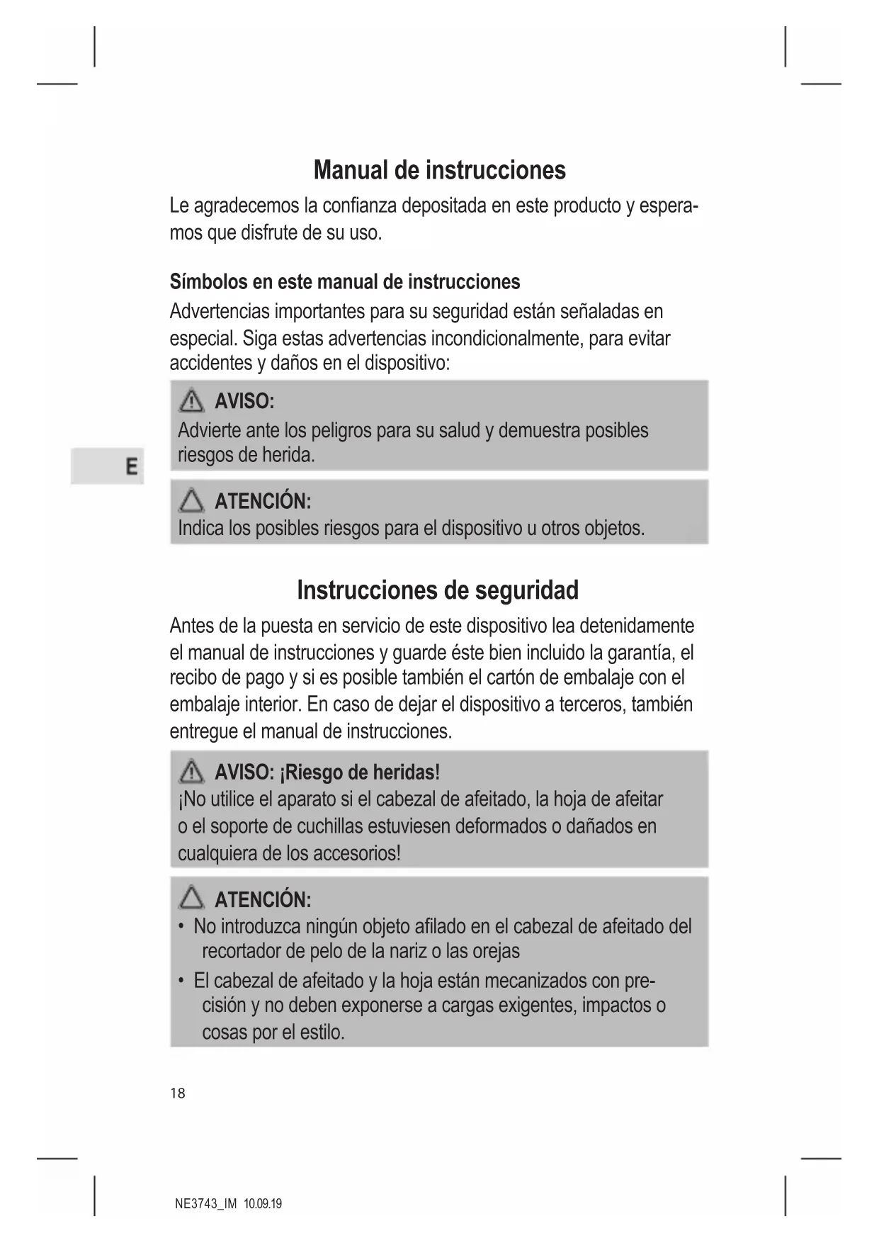 - Ne jetez pas l’appareil en n de vie avec les déchets ménagers. Apportez-le à un centre de collecte autorisé pour être recyclé. Vous participez ainsi à la protection de l’environnement.18 NE3743_IM 10.09.19 Manual de instrucciones Le agradecemos la conanza depositada en este producto y espera- mos que disfrute de su uso. Símbolos en este manual de instrucciones Advertencias importantes para su seguridad están señaladas en especial. Siga estas advertencias incondicionalmente, para evitar accidentes y daños en el dispositivo: AVISO: Advierte ante los peligros para su salud y demuestra posibles riesgos de herida. ATENCIÓN: Indica los posibles riesgos para el dispositivo u otros objetos. Instrucciones de seguridad Antes de la puesta en servicio de este dispositivo lea detenidamente el manual de instrucciones y guarde éste bien incluido la garantía, el recibo de pago y si es posible también el cartón de embalaje con el embalaje interior. En caso de dejar el dispositivo a terceros, también entregue el manual de instrucciones. AVISO: ¡Riesgo de heridas! ¡No utilice el aparato si el cabezal de afeitado, la hoja de afeitar o el soporte de cuchillas estuviesen deformados o dañados en cualquiera de los accesorios! ATENCIÓN: